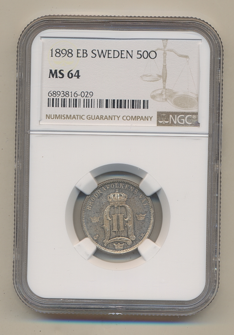 Coins, Sweden. Oskar II, MIS I.8, 50 öre 1898. Graded MS64 by NGC. 01/0. See certification at NGC