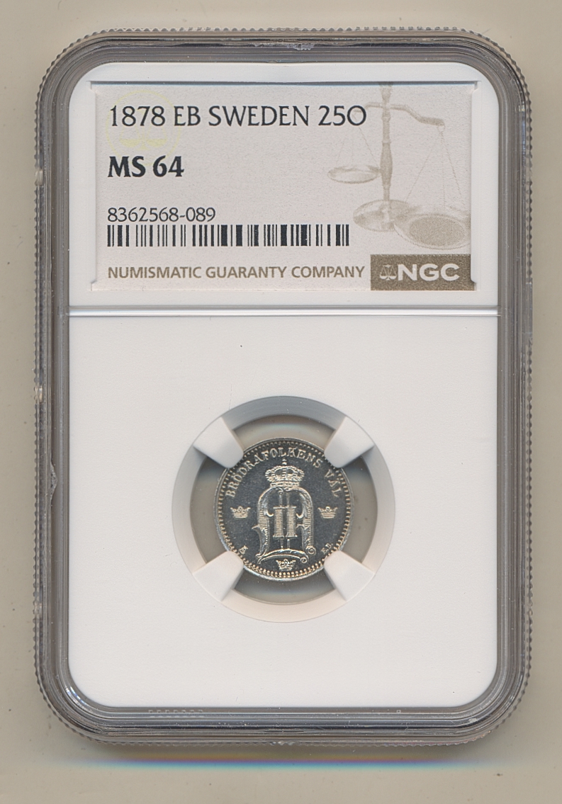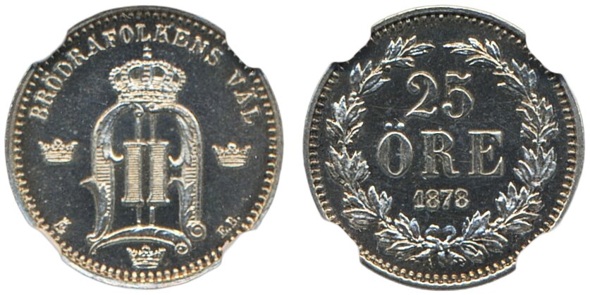 Coins, Sweden. Oskar II, MIS I.6b, 25 öre 1878. Graded MS64 by NGC. Unusually beautiful example of this key date. 01/0. See certification at NGC