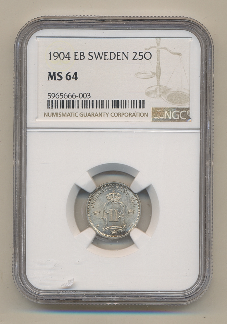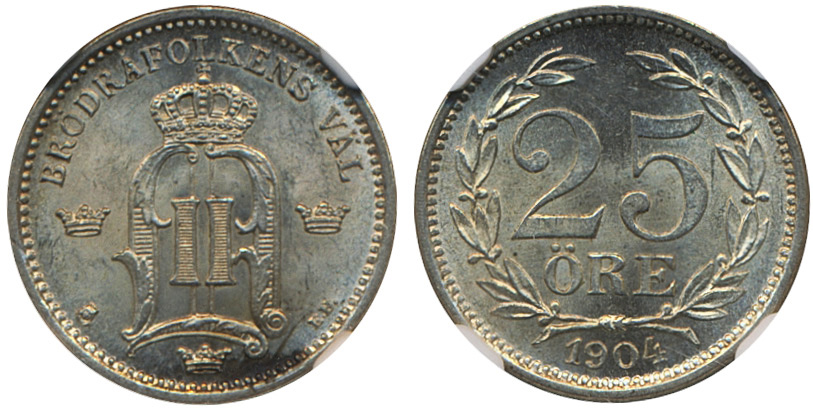 Coins, Sweden. Oskar II, MIS II.15a, 25 öre 1904. Graded MS64 by NGC. 01/0. See certification at NGC