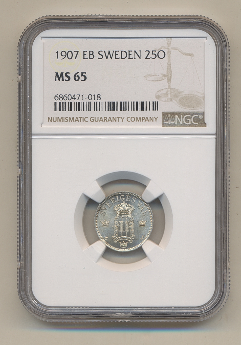 Coins, Sweden. Oskar II, MIS IIIb, 25 öre 1907. Graded MS65 by NGC. 0. See certification at NGC