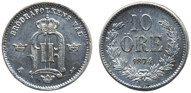Coins, Sweden. Oskar II, MIS I.1, 10 öre 1874. 01/0.