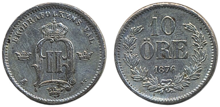 Coins, Sweden. Oskar II, MIS I.3b, 10 öre 1876. Re-punched 6 in date. Lightly cleaned. 1+/01.