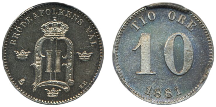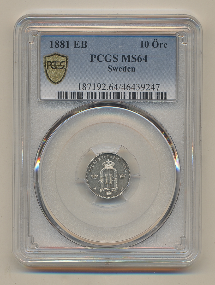 Coins, Sweden. Oskar II, SM 114, 10 öre 1881. Graded by PCGS as MS64. UNC. See certification at PCGS