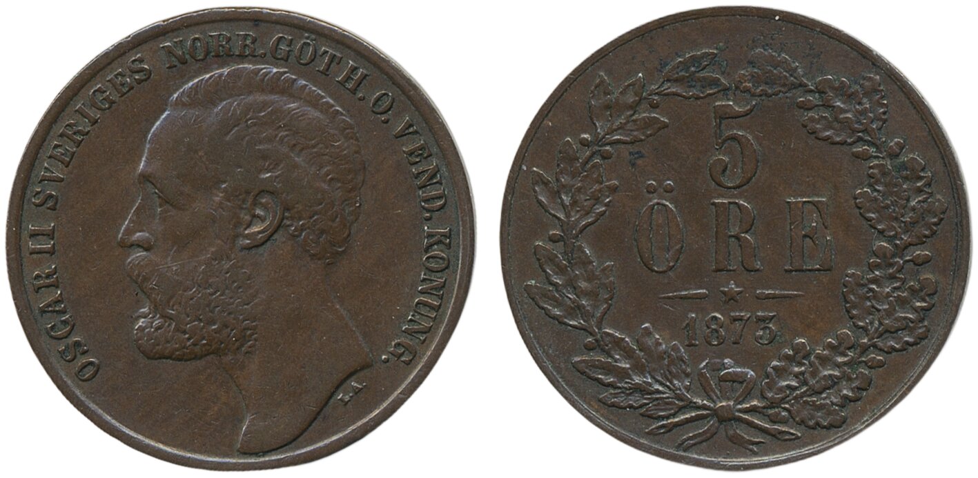 Coins, Sweden. Oskar II, SM 132a, 5 öre 1873. One year type. 1+)(1+/01.
