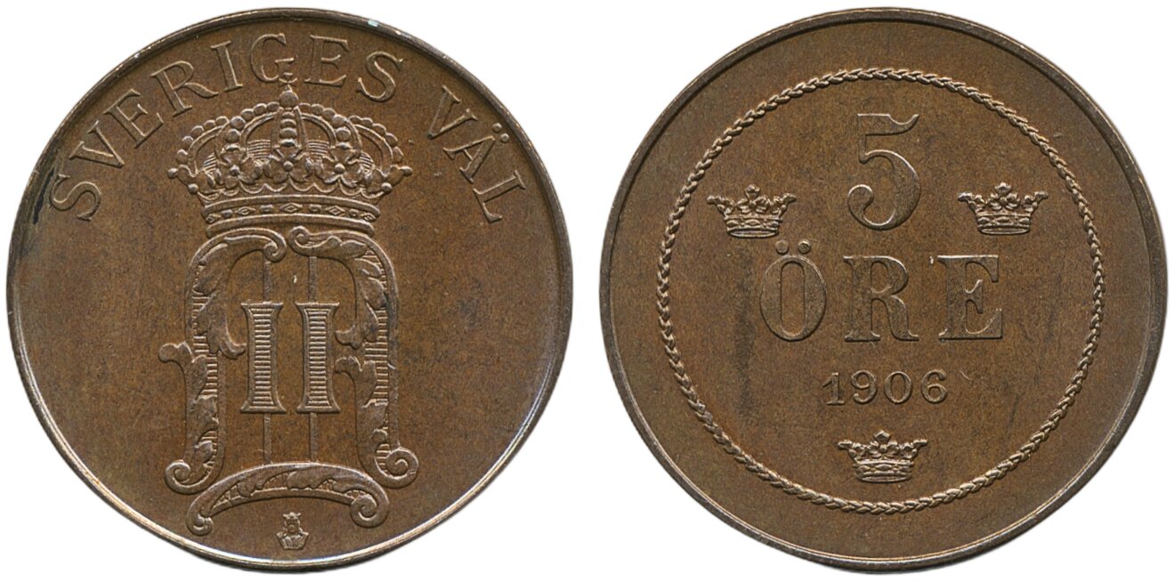 Coins, Sweden. Oskar II, MIS II.1a, 5 öre 1906. 01/0.
