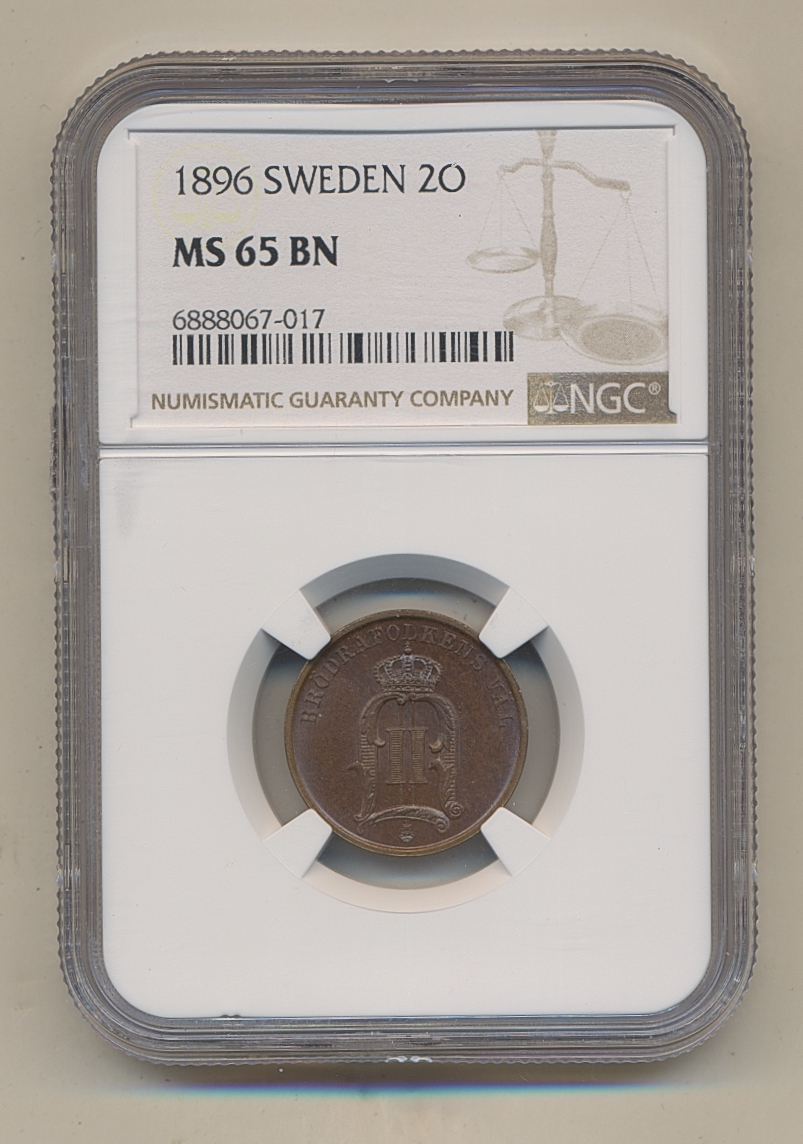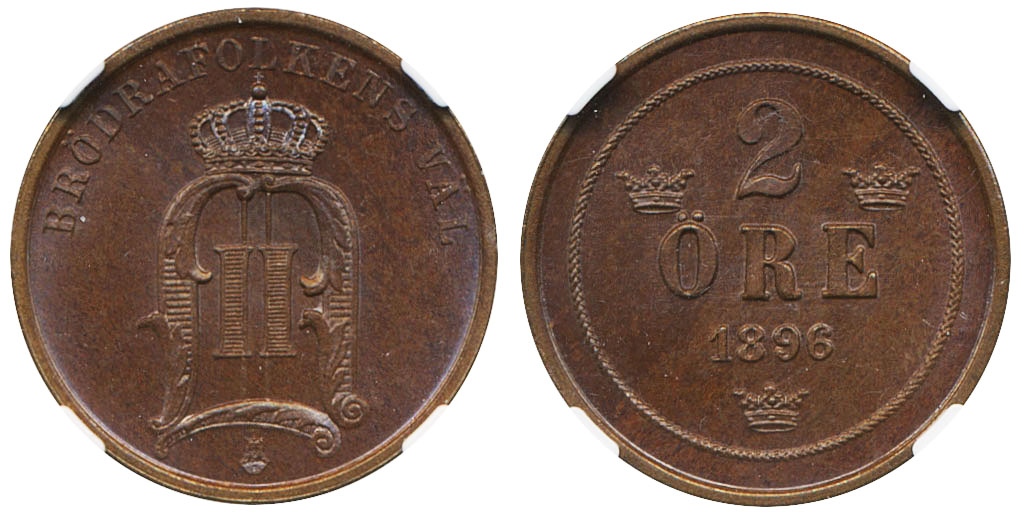Coins, Sweden. Oskar II, MIS II.25, 2 öre 1896. Graded MS65 BN by NGC. 0. See certification at NGC