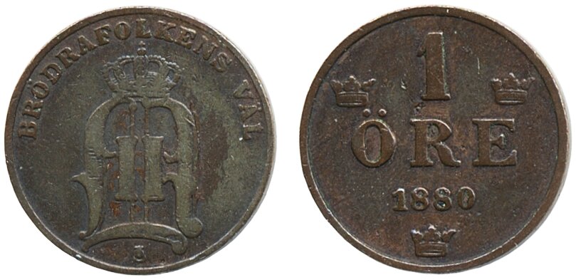 Coins, Sweden. Oskar II, MIS III.1, 1 öre 1880. Medium text. Scratches, pecks. Scarce! 1?