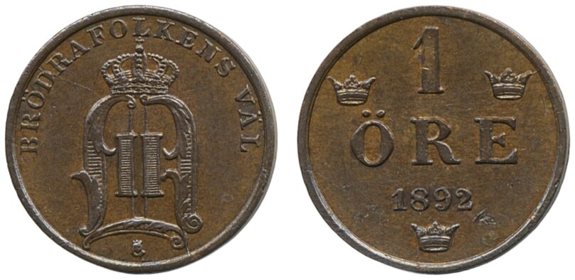 Coins, Sweden. Oskar II, MIS III.17, 1 öre 1892. Scarce key date in high grade. 01/0.