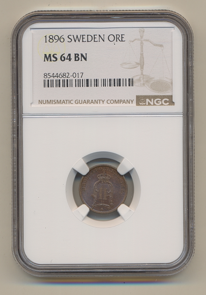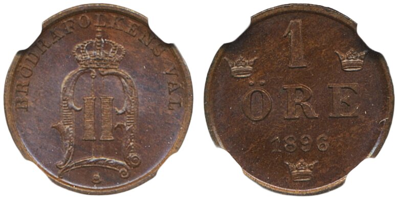 Coins, Sweden. Oskar II, MIS III.21, 1 öre 1896. Graded by NGC as MS64 BN. 01/0. See certification at NGC