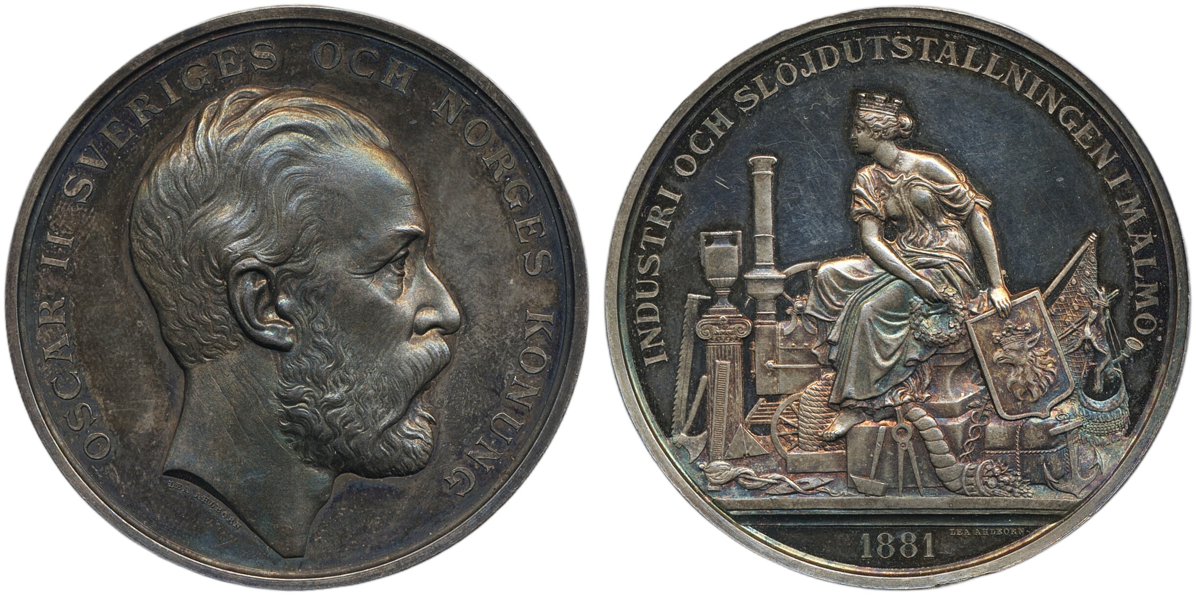 Medals, regal, Sweden. Oskar II, Silver medal issued to 1881 Industrial exhibition in Malmö. 67.98 g, 51 mm. Lustrous and beautiful example in original box. 01/0.