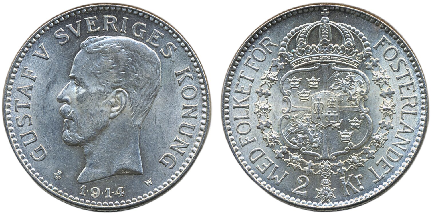 Coins, Sweden. Gustav V, MIS I.5, 2 kronor 1914. 01/0.