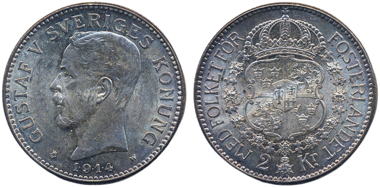 Coins, Sweden. Gustav V, MIS I.5, 2 kronor 1914. 01/0.
