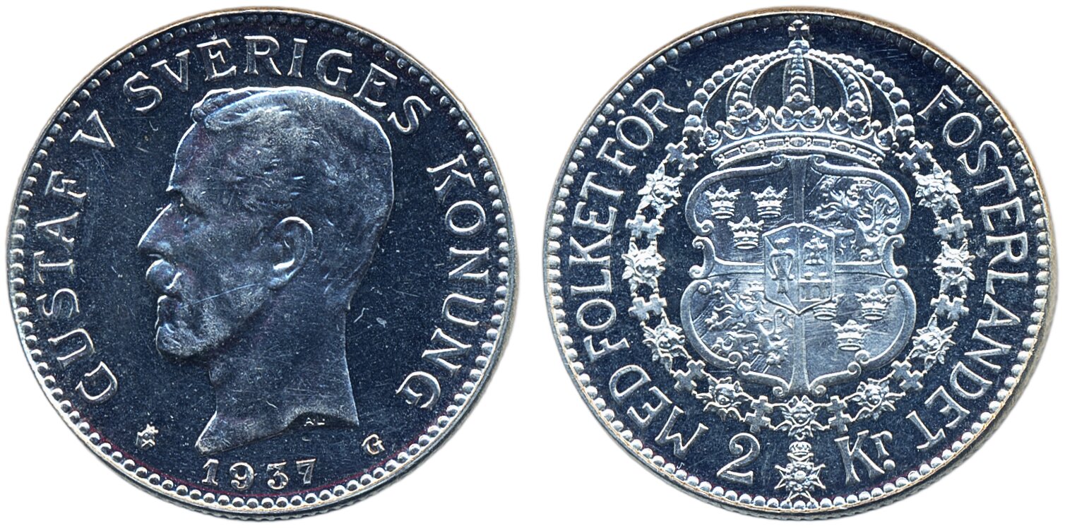Coins, Sweden. Gustav V, MIS I.17, 2 kronor 1937. Prooflike fields with minor handling marks. 01/0.