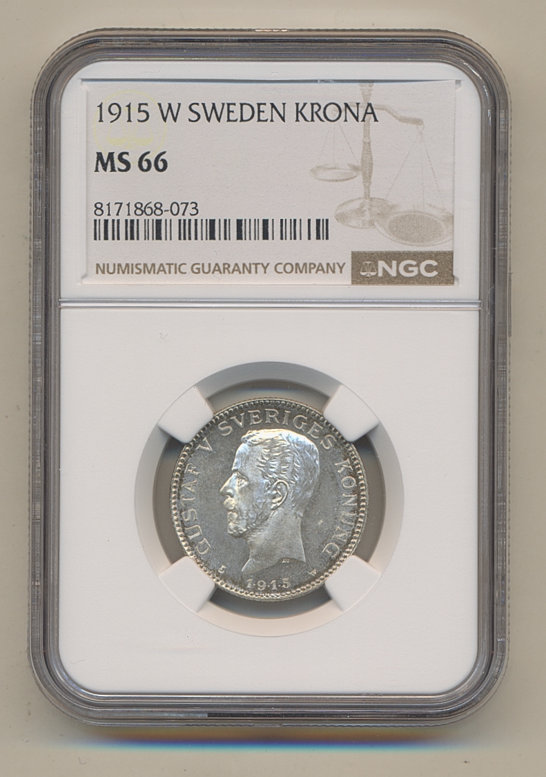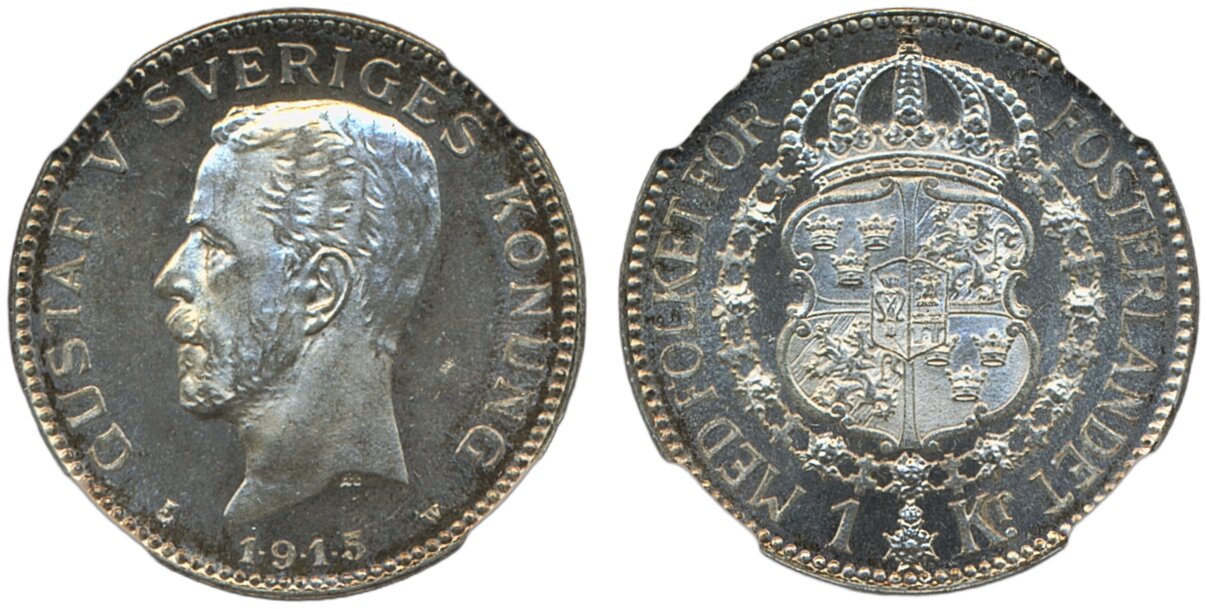 Coins, Sweden. Gustav V, MIS I.5b, 1 krona 1915/4. Superb example with minor handling marks. Graded by NGC as MS66. The overdate has not been correctly recognized by NGC on the label. 0. See certification at NGC