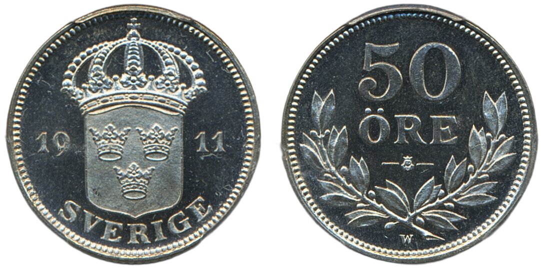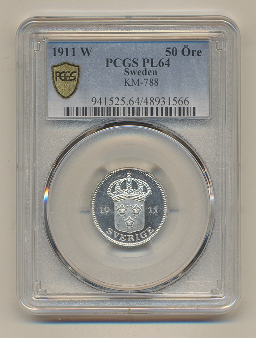Coins, Sweden. Gustav V, MIS I.1, 50 öre 1911. Full mirror proof example. Graded by PCGS as PL64. 01/0. See certification at PCGS