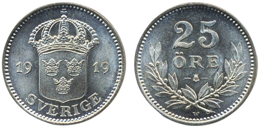 Coins, Sweden. Gustav V, MIS I.7, 25 öre 1919. Very nice example with preserved lustre. 0.