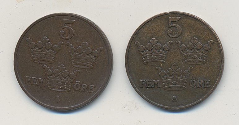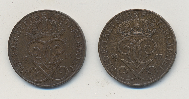Coins, Sweden. Gustav V, MIS I.2, 5 öre 1910, 1927. Small lot of two circulated examples of the key dates of the series. 1.