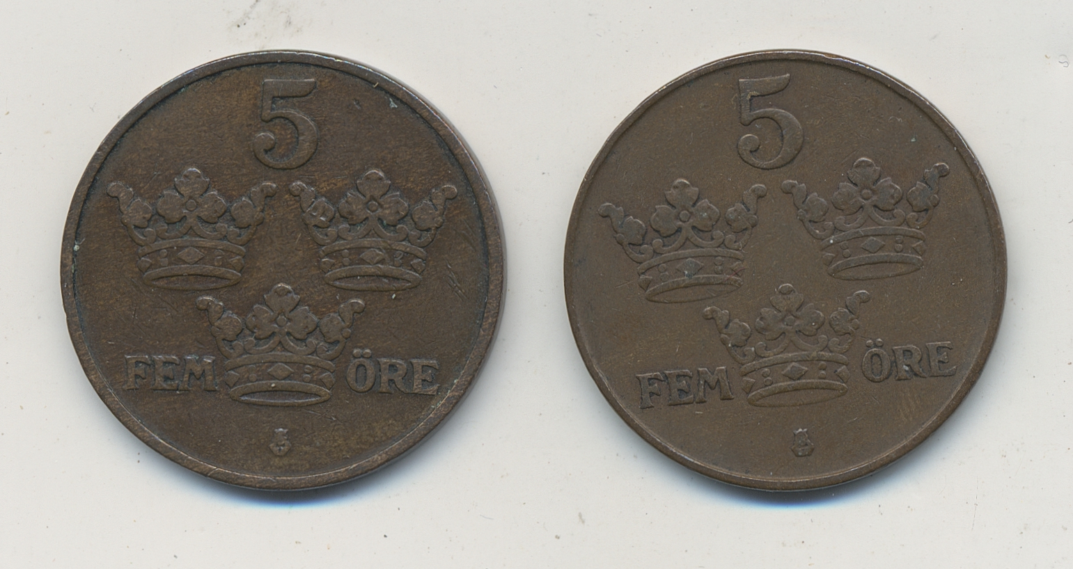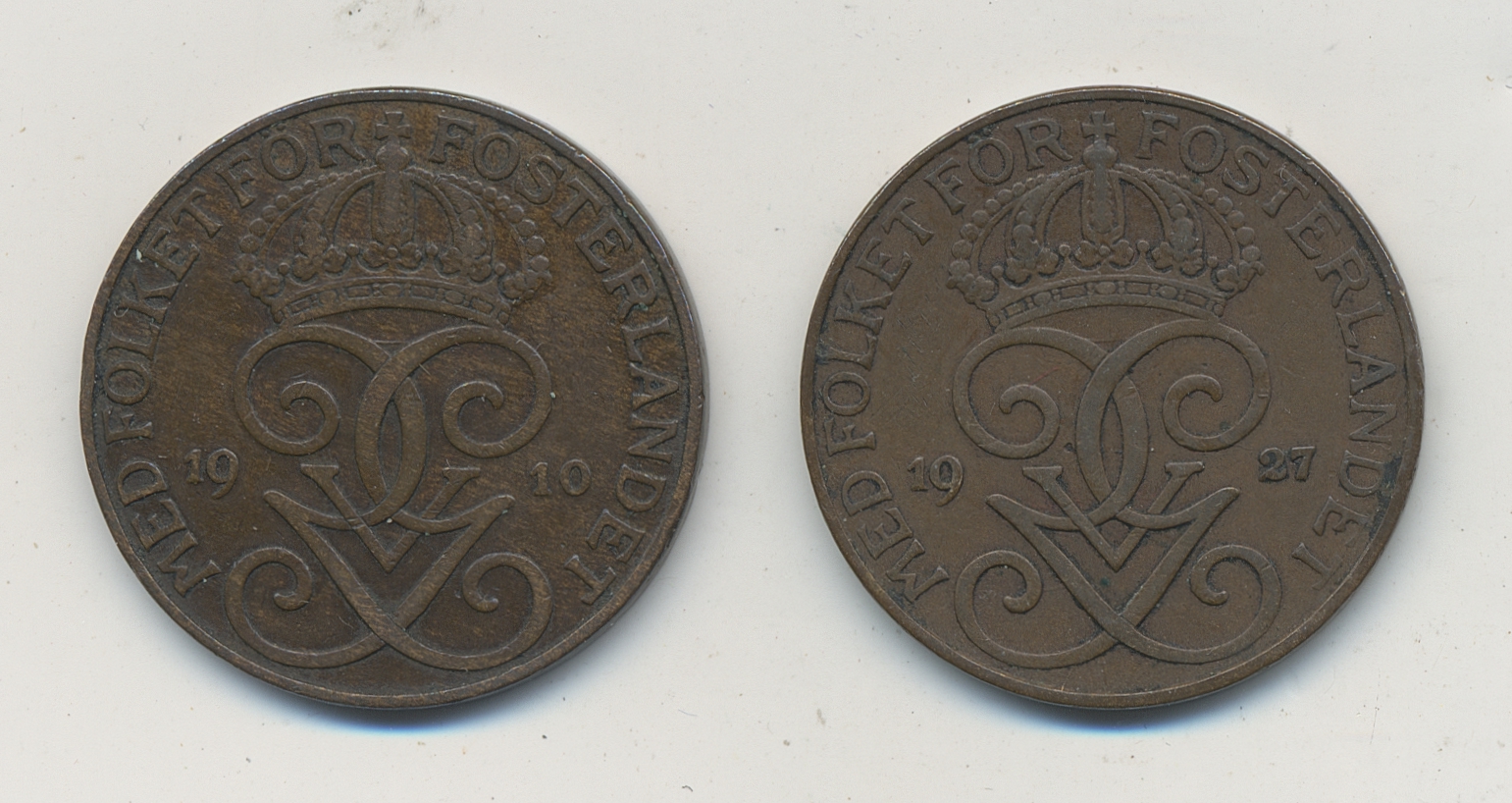 Coins, Sweden. Gustav V, MIS I.2, I.18, 5 öre. 1910 1, 1927 1/1+.