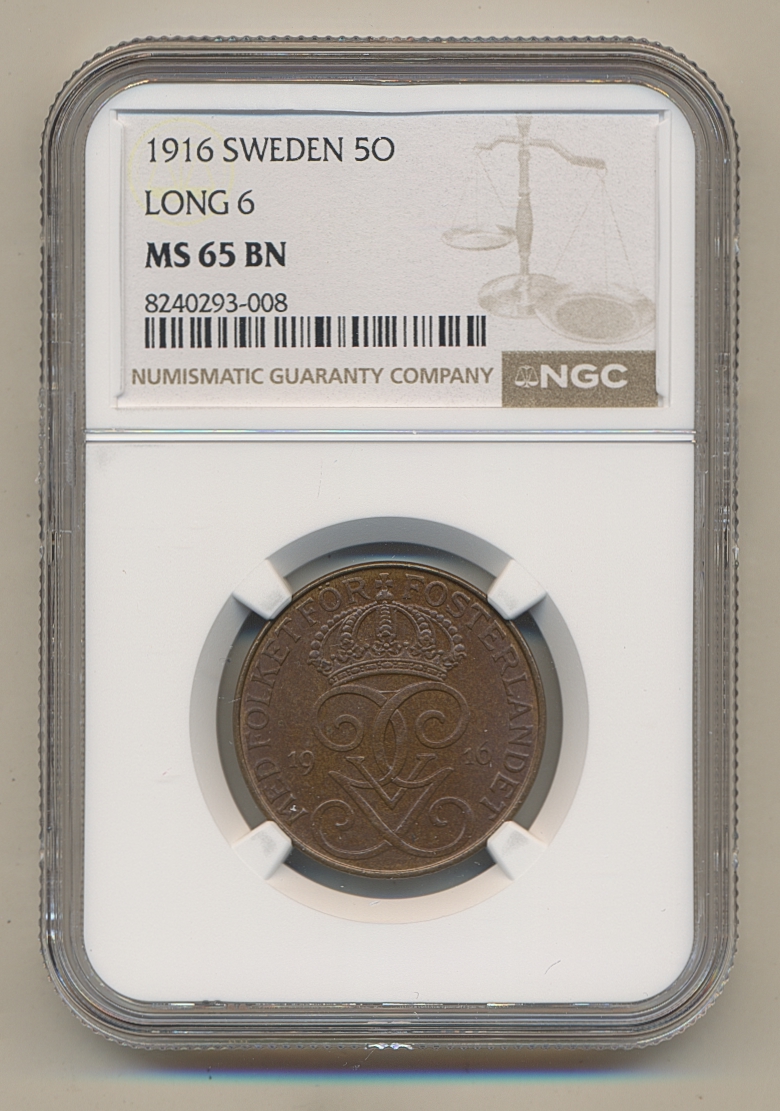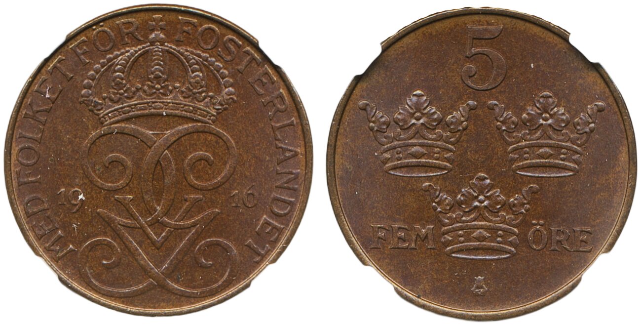 Coins, Sweden. Gustav V, MIS I.8c, 5 öre 1916. Long 6. Graded by NGC as MS65 BN. 0. See certification at NGC