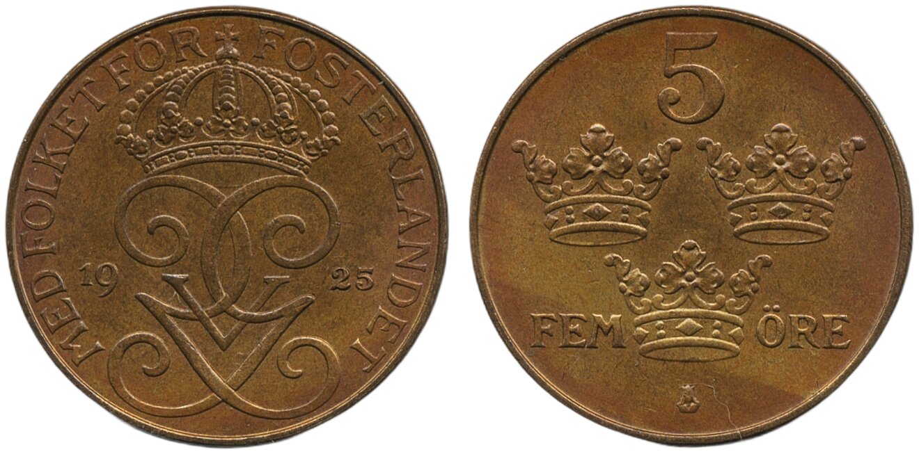 Coins, Sweden. Gustav V, MIS I.16, 5 öre 1925. 01/0.