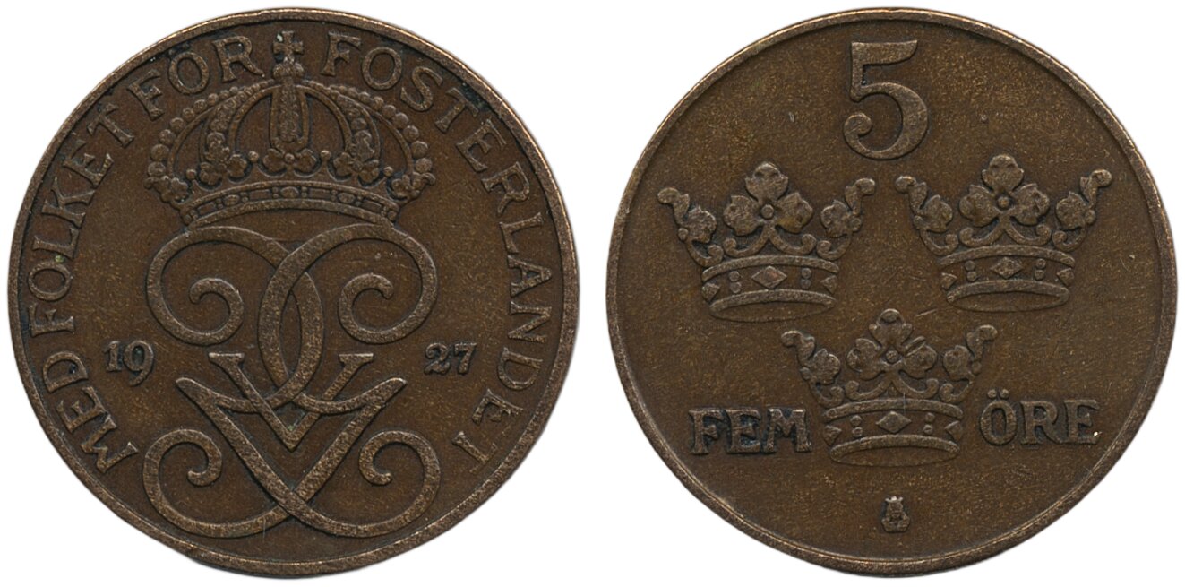 Coins, Sweden. Gustav V, MIS I.18, 5 öre 1927. 1/1+.