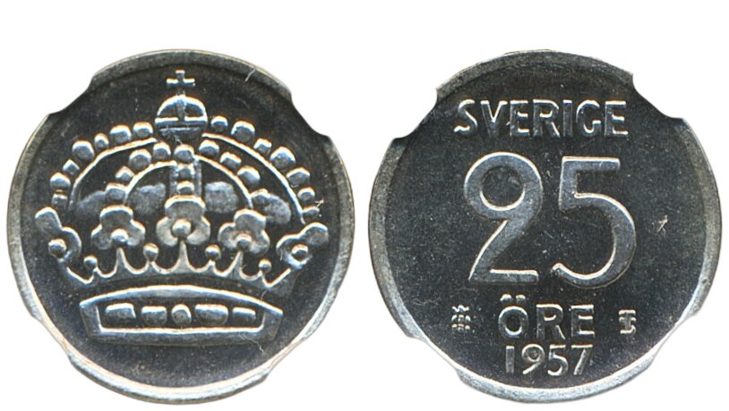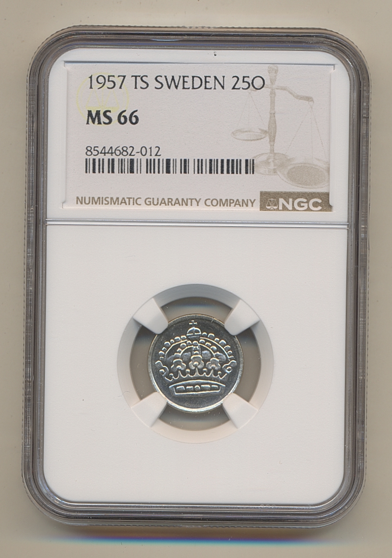 Coins, Sweden. Gustav VI Adolf, MIS I.6, 25 öre 1957. Graded by NGC as MS66. 0. See certification at NGC