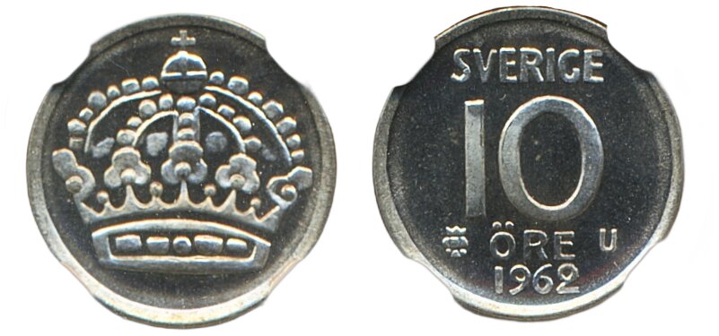 Coins, Sweden. Gustav VI Adolf, MIS I.12, 10 öre 1962. Superb example with mirror surfaces. Graded by NGC as MS67+ PL. 0. See certification at NGC