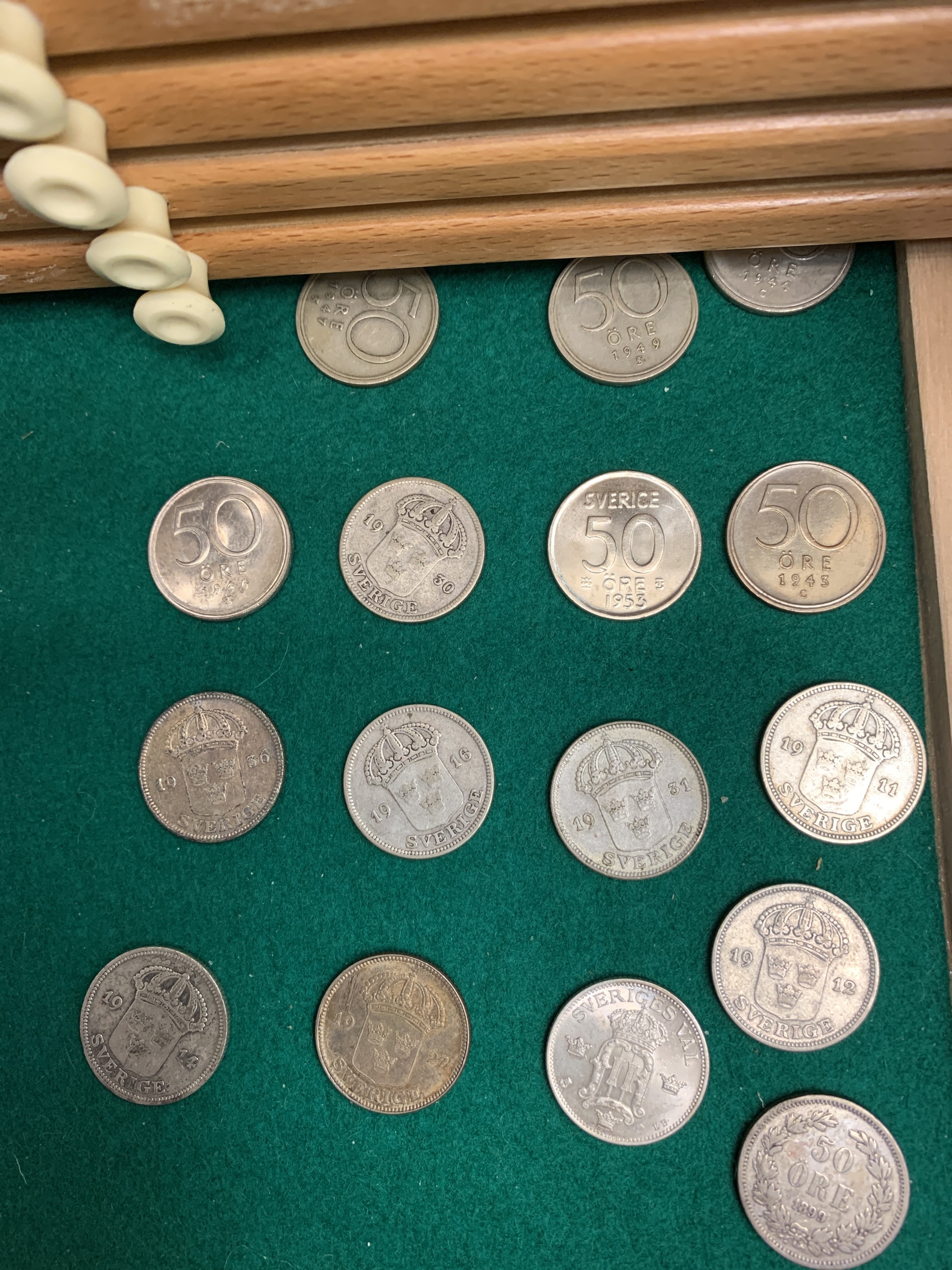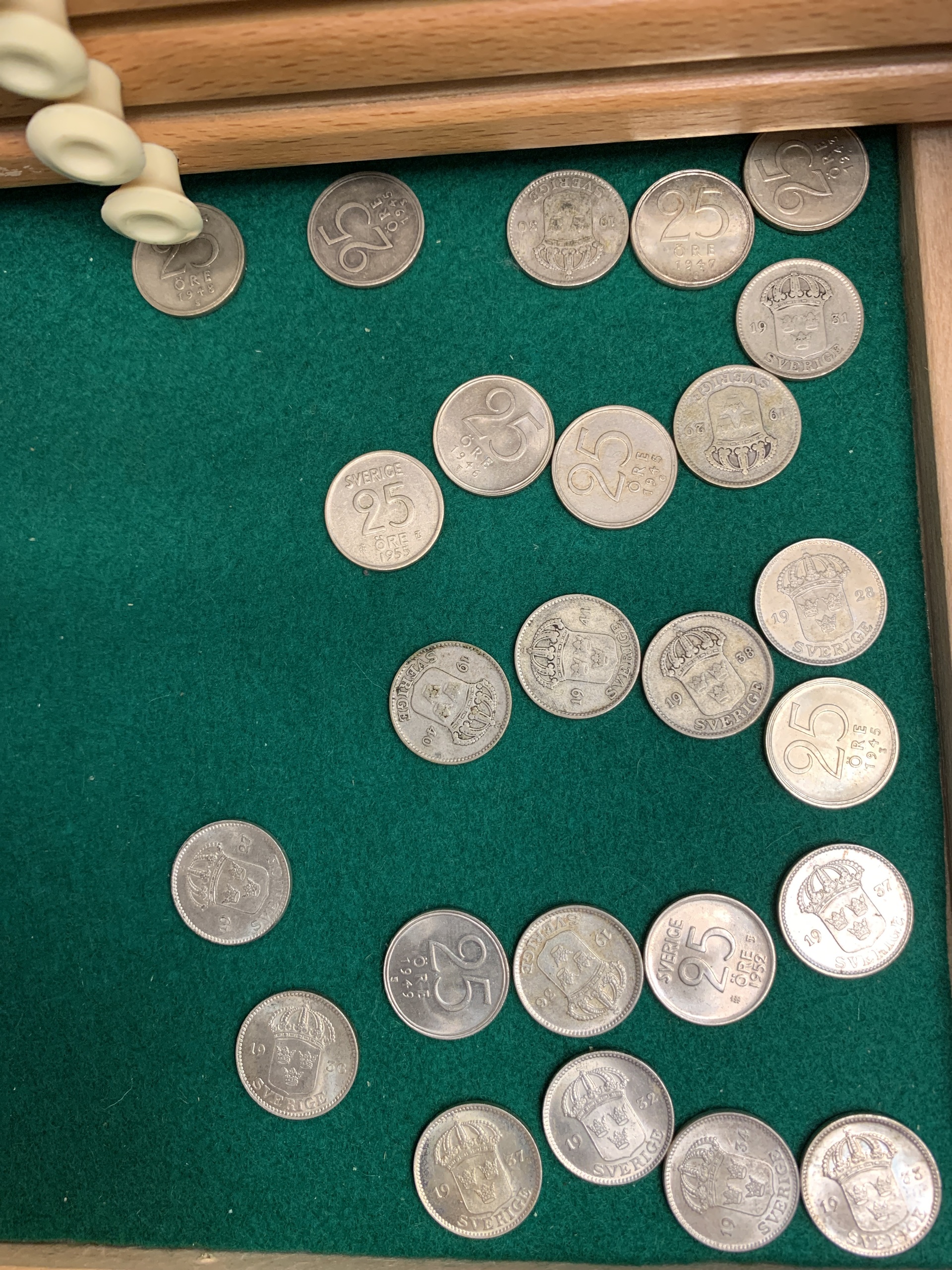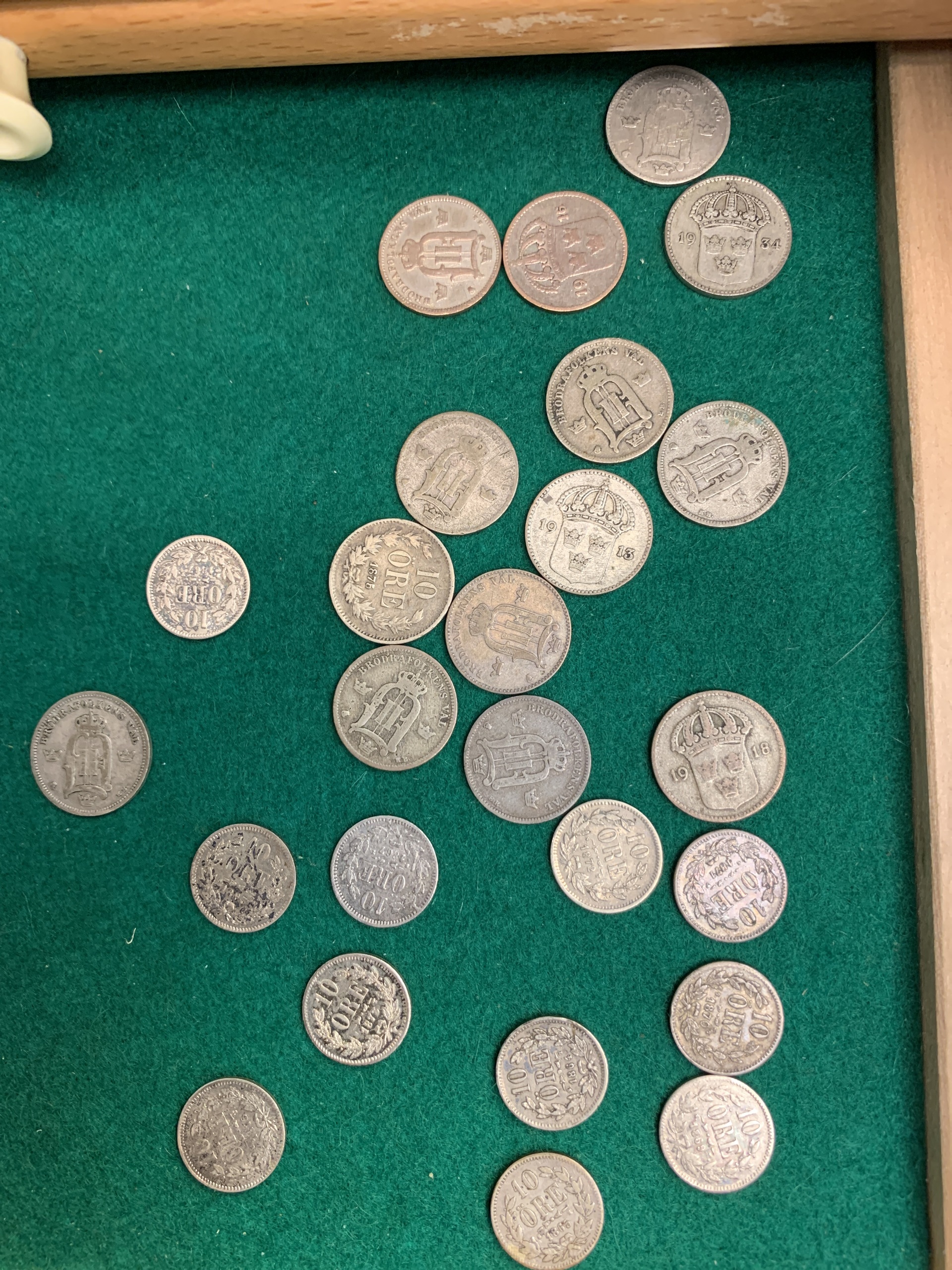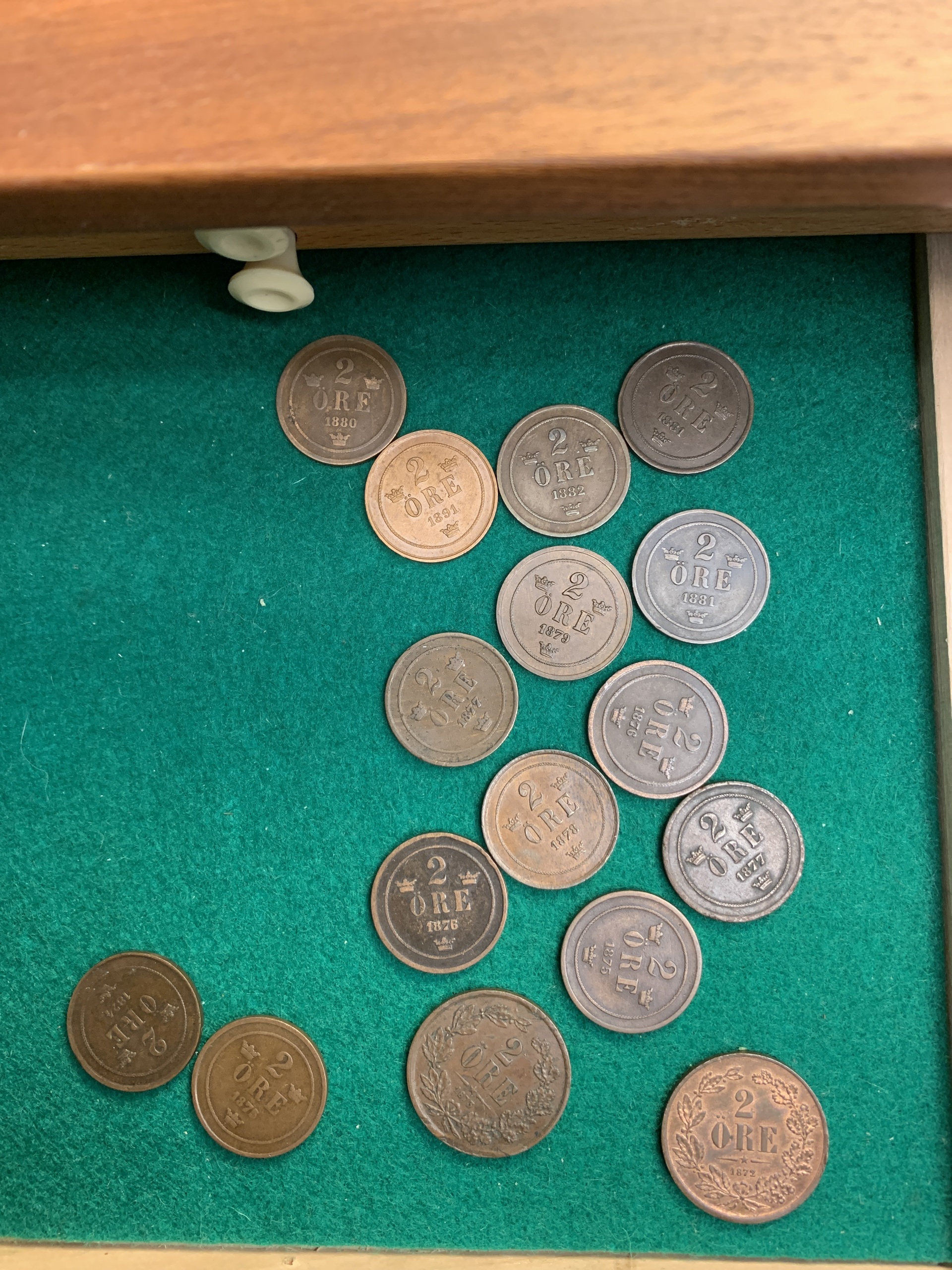Coins, Sweden. Coin cabinet in wood 'Numis original' with twelve drawers. Some good qualities included. Please see a selection of scans at www.philea.se. Please inspect! Approx. 5 kg.
