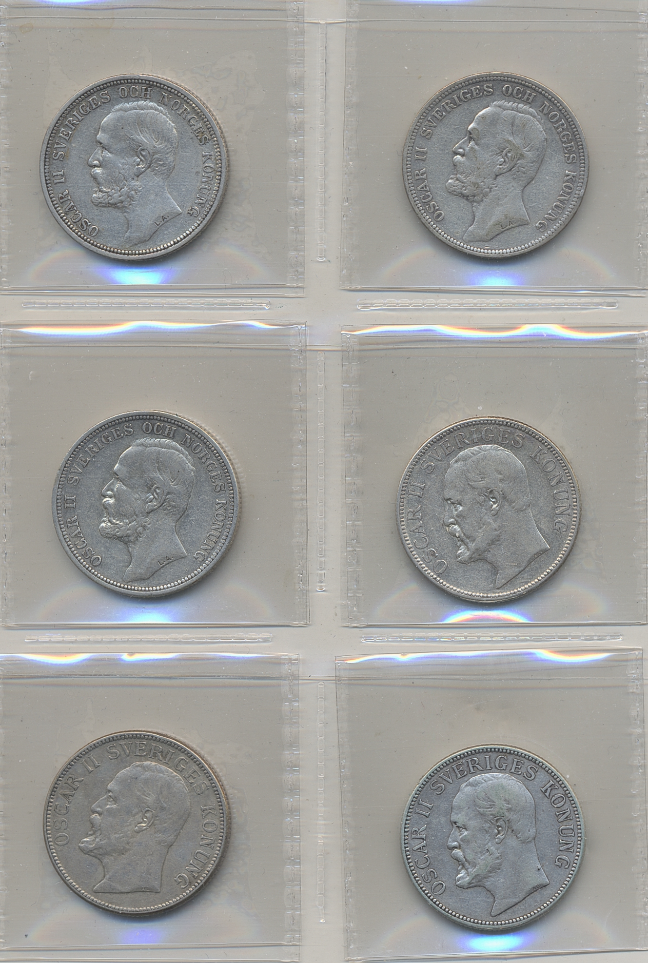 Coins, Sweden. Lot Oskar II. 2 kronor 1892, 1893, 1898, 1906 and 1907 (two). Six coins in total. The entire lot is presented at www.philea.se. Mixed quality.