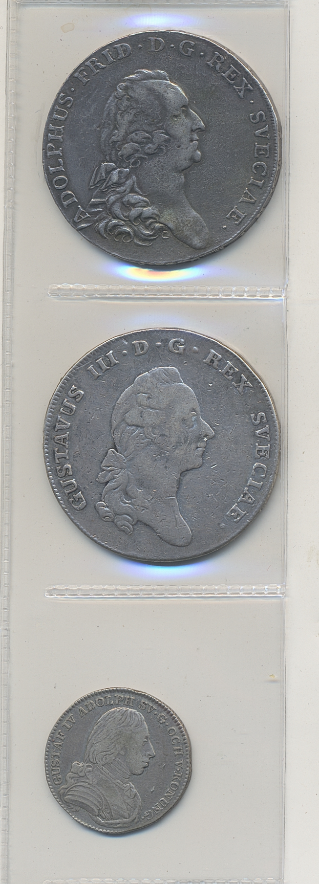 Coins, Sweden. Lot of 3 silver coins including mounted 3 daler SM 1770 and riksdaler 1777. Also a 1/6 riksdaler 1805. 1-1+.