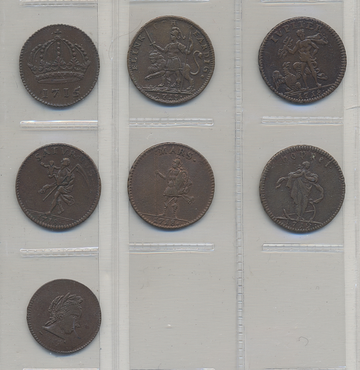 Coins, Sweden. Lot. Emergency coins. Six different + contemporary medal depicting G.H. von Görtz. The entire lot is presented at www.philea.se. Mixed quality.