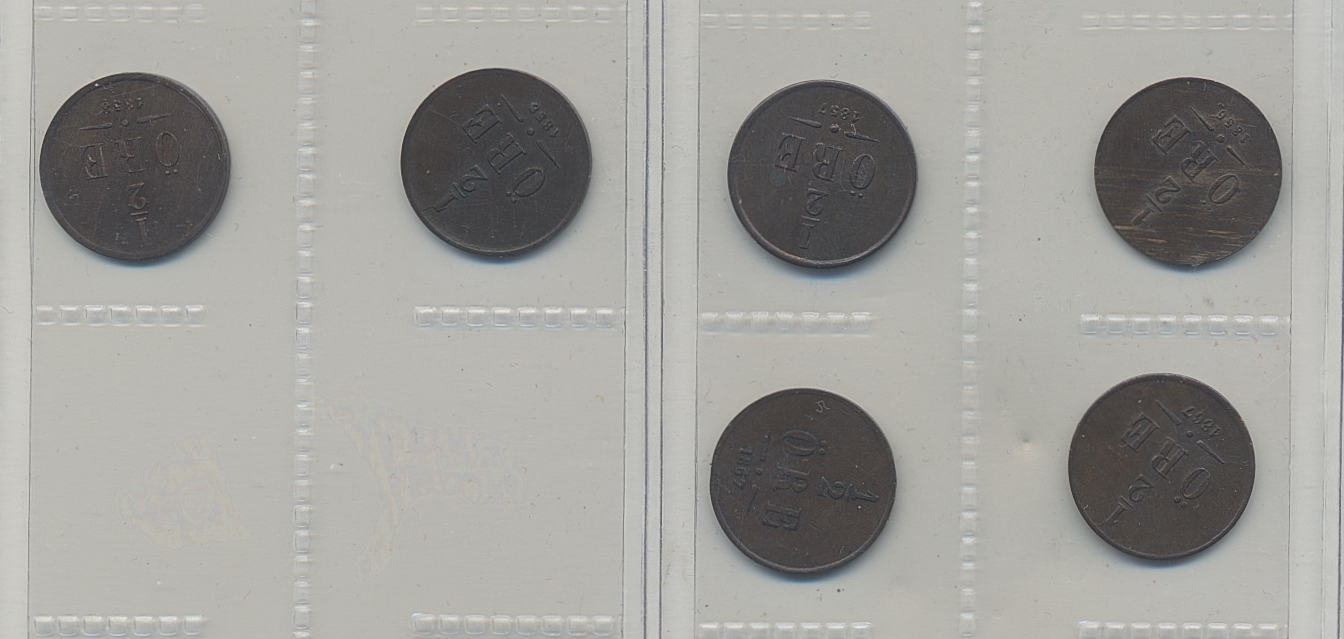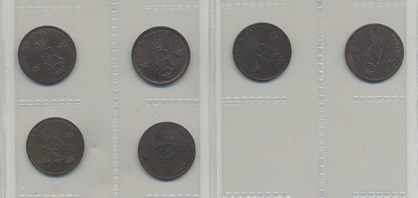 Coins, Sweden. Lot. ½ öre 1856, 1857, 1858 (two) and 1867 (two). The entire lot is presented at www.philea.se. Mixed quality.