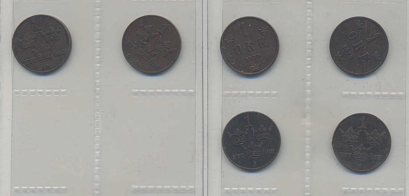 Coins, Sweden. 1 öre. Lot. 1879 medium and long text, 1909 small and large cross (corroded), and 1914 closed and open 4. Six coins in total. The entire lot is presented at www.philea.se. Mixed quality.