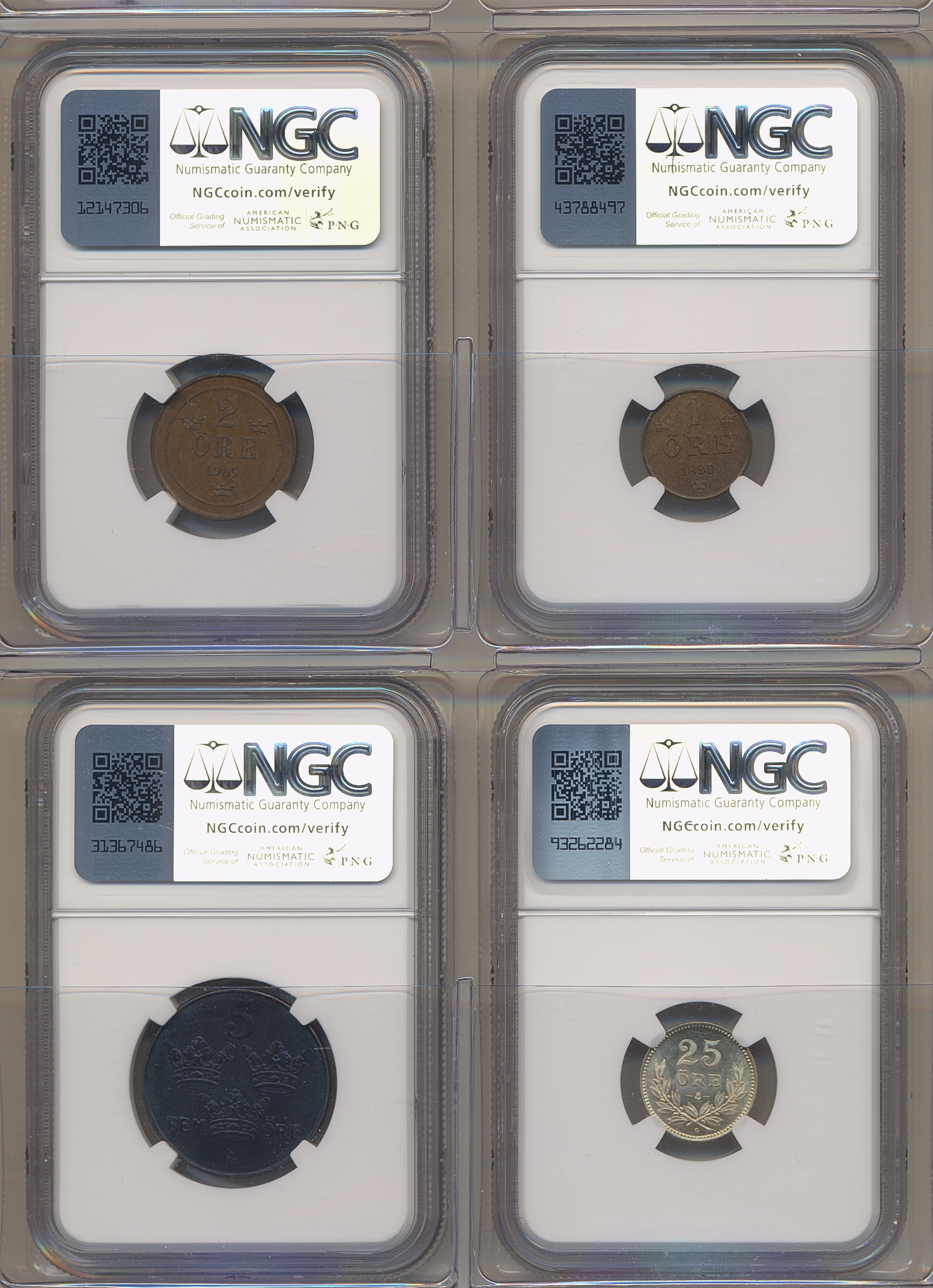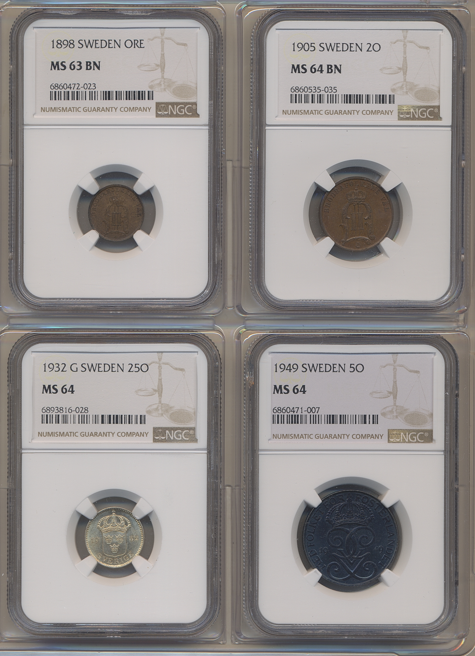 Coins, Sweden. 1 öre 1898 MS63 BN, 2 öre 1905 MS64 BN, 5 öre 1949 MS64 and 25 öre 1932 MS64. All graded by NGC. (4).