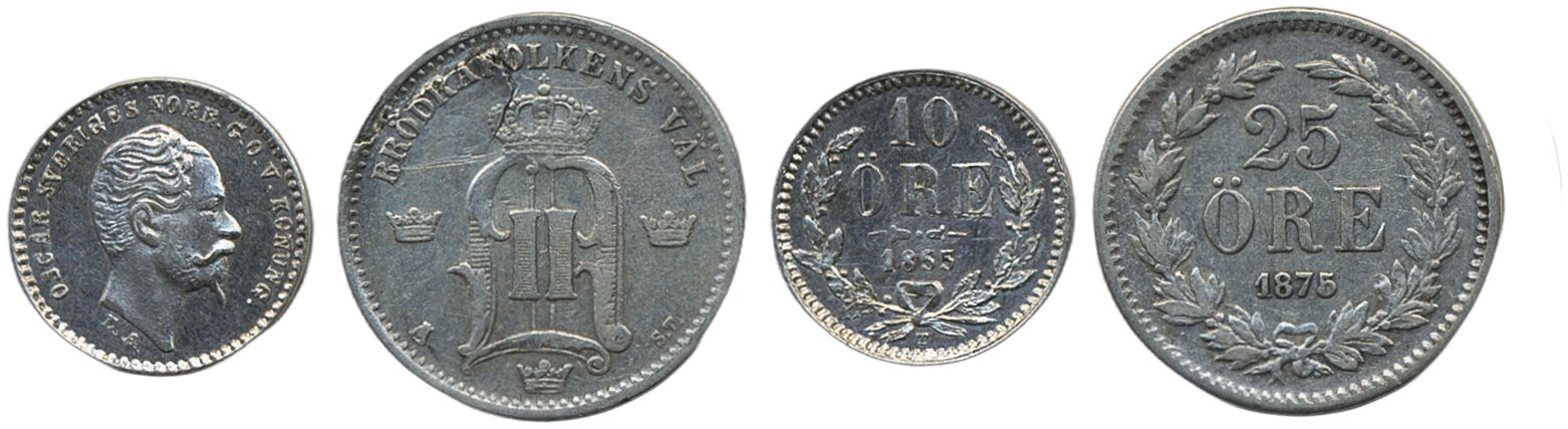 Coins, Sweden. MIS 4, 3b, Lot. Oskar I 10 öre 1855 Mintmark T. SMB 66 01 + Oskar II 25 öre 1875 Planchet flaw. SMB 77 1/1+.