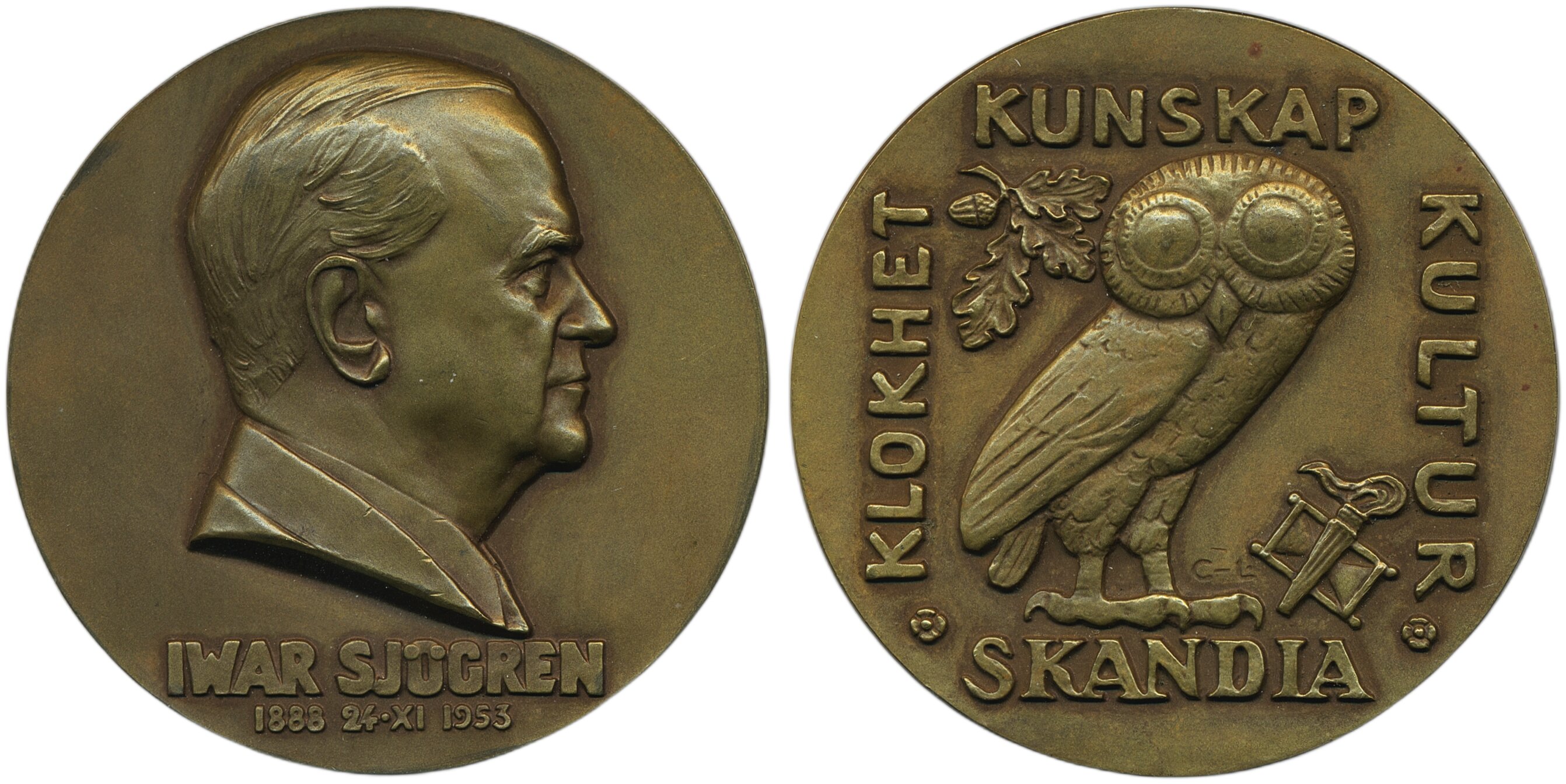 Medals, non-regal, Sweden. Ivar Sjögren (1888-1972). Insurance director in Skandia. Medal in bronze, 56 mm, 90 g. For his 65th birthday by Gösta Carell. 01.