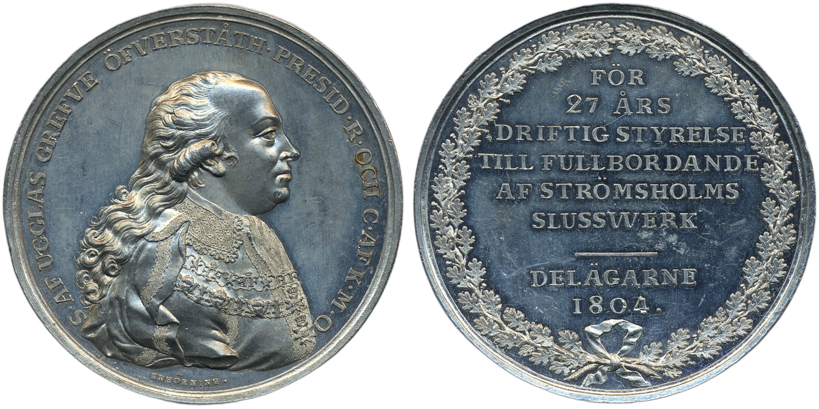 Medals, non-regal, Sweden. Hyckert II:30:5, Samuel af Ugglas (1750-1812). Governor. Medal in tin, 58 mm, 66.1 g., by C. Enhörning 1804 for Strömsholms canal locks. Small scratches. 01.