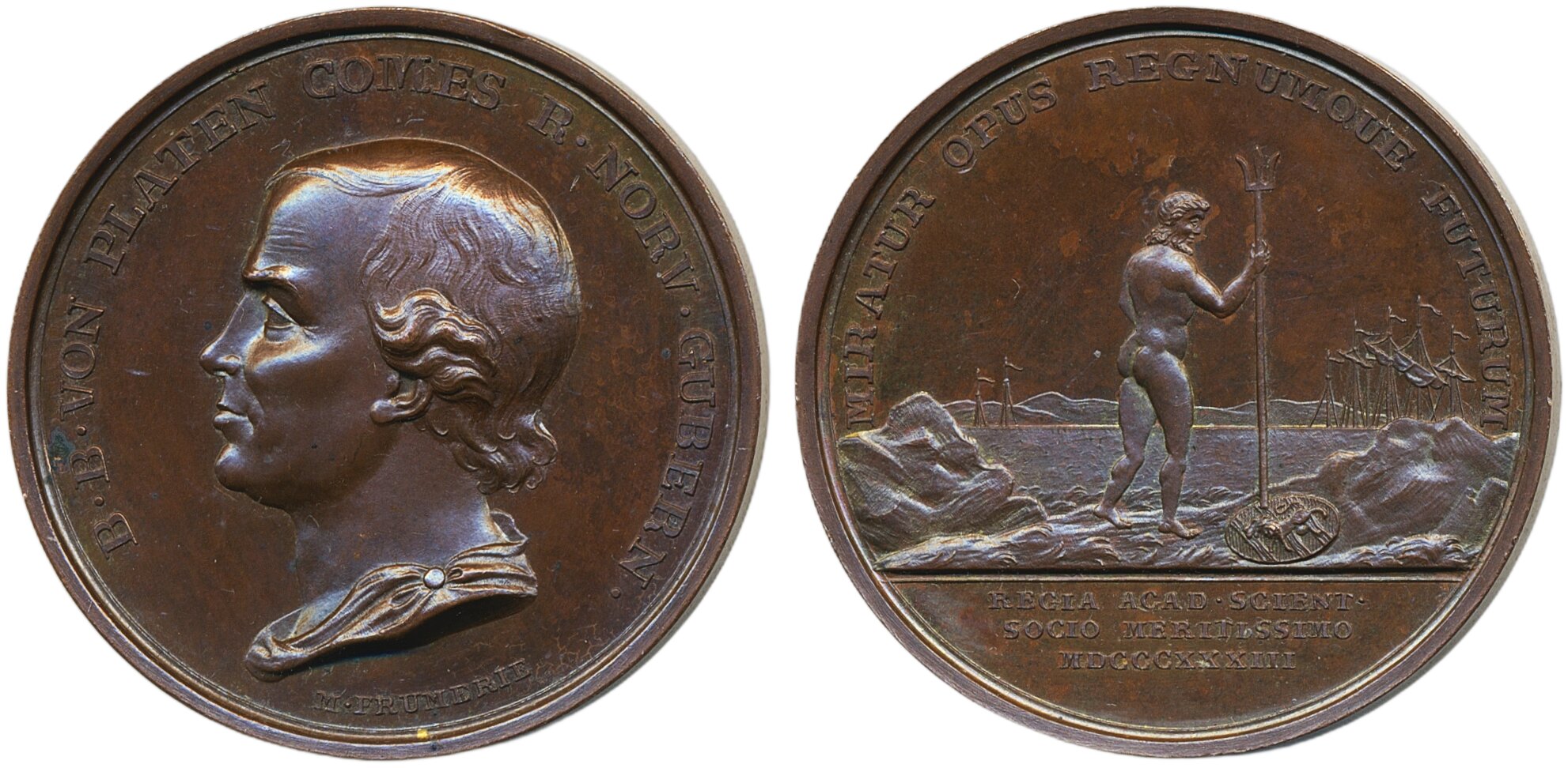 Medals, non-regal, Sweden. Hyckert II:80:1, Baltzar von Platen (1766-1829). Canal builder. Medal in bronze, 41 mm, 32.2 g., by M. Frumerie for The Royal Swedish Academy of Sciences 1833. KVA. Insignificant peck. 01.