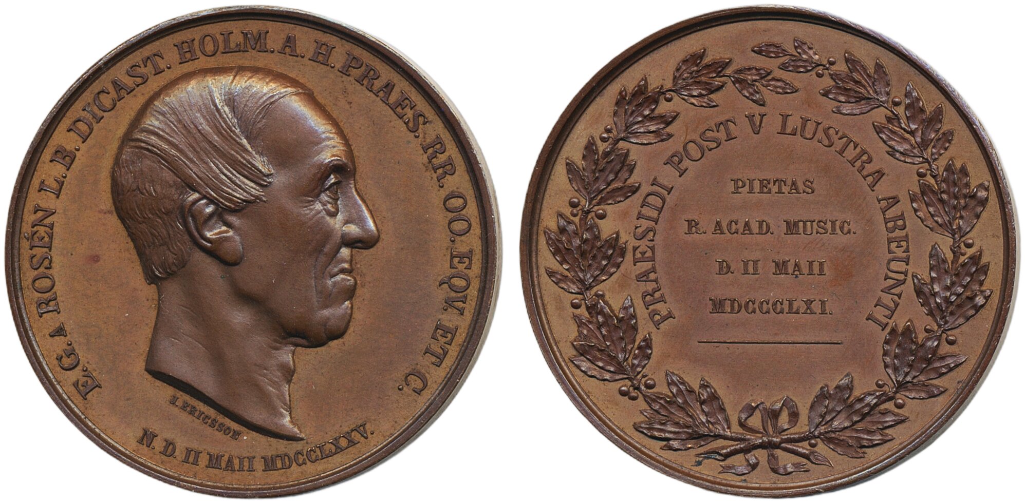 Medals, non-regal, Sweden. Hyckert II:156, Erik Gabriel von Rosén (1775-1866). Lawyer and musician. Medal in bronze, 41 mm, 29.1 g., by J. Ericsson for The Royal Swedish Academy of Music1862. Lindskog 20, NUF 2016:178. 01/0.