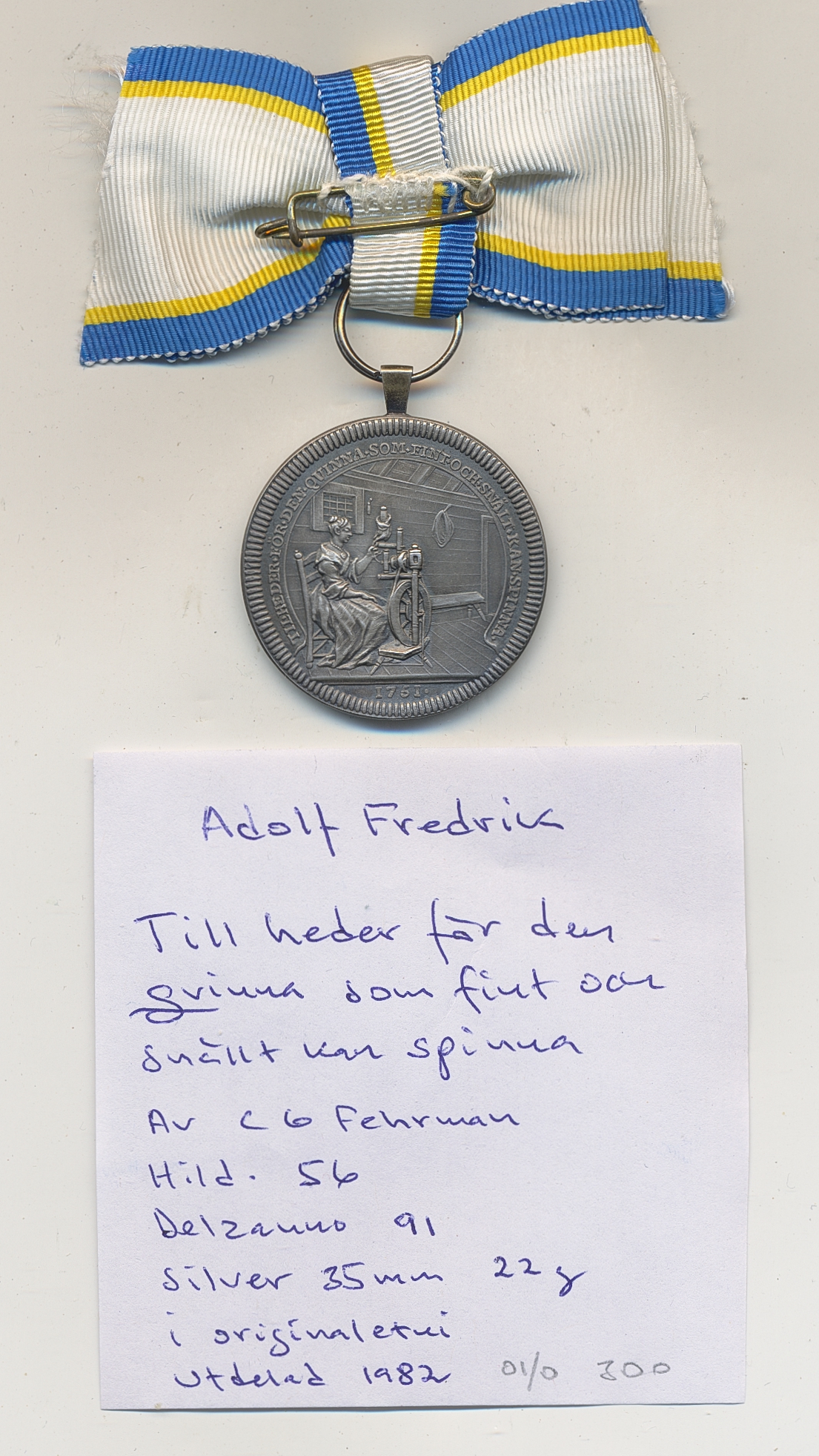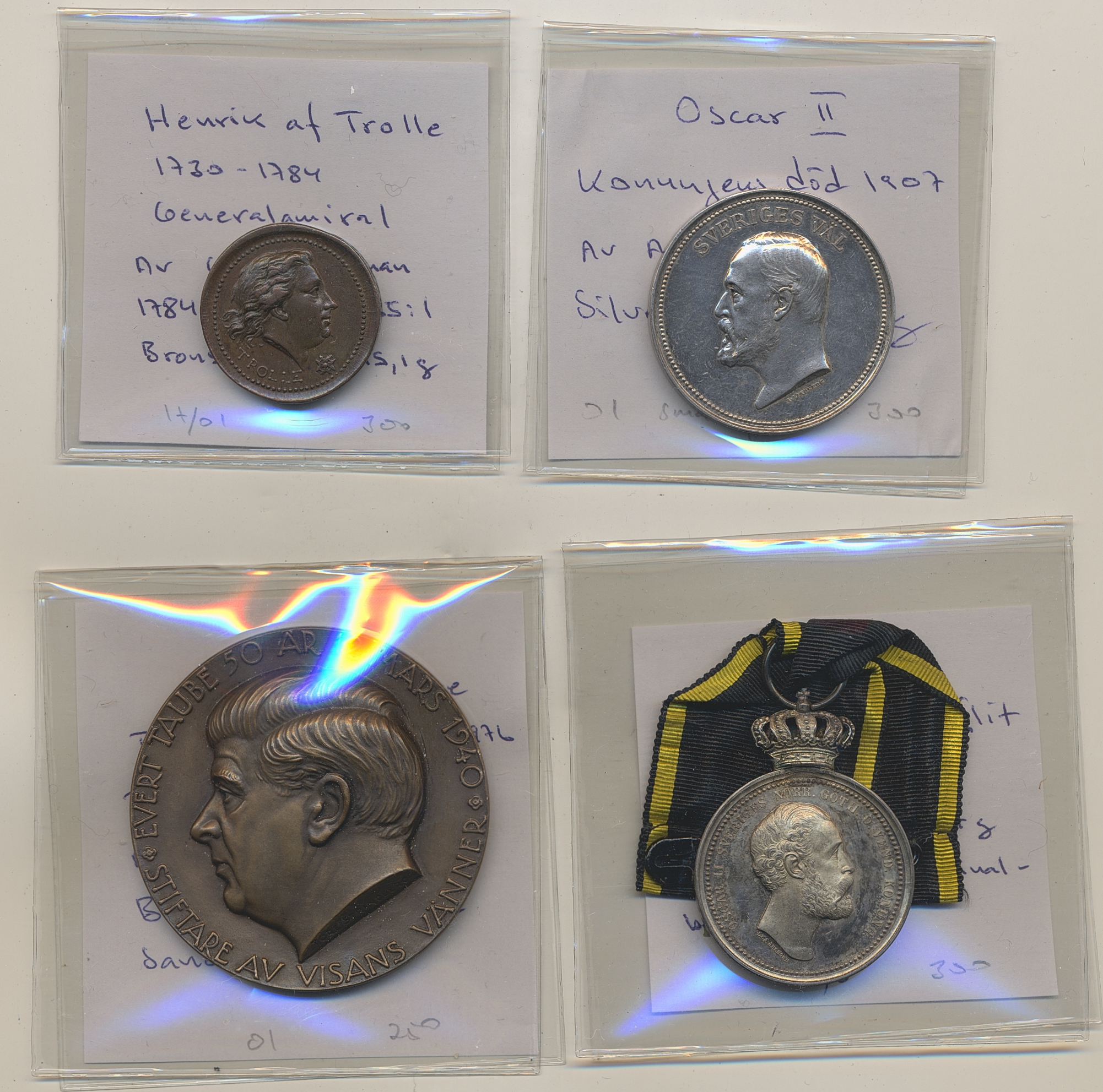 Medals, non-regal, Sweden. Box with five medals in silver and bronze, Adolf Fredrik, Oskar II, Henrik Trolle and Evert Taube, 1784–1982. 01/0.