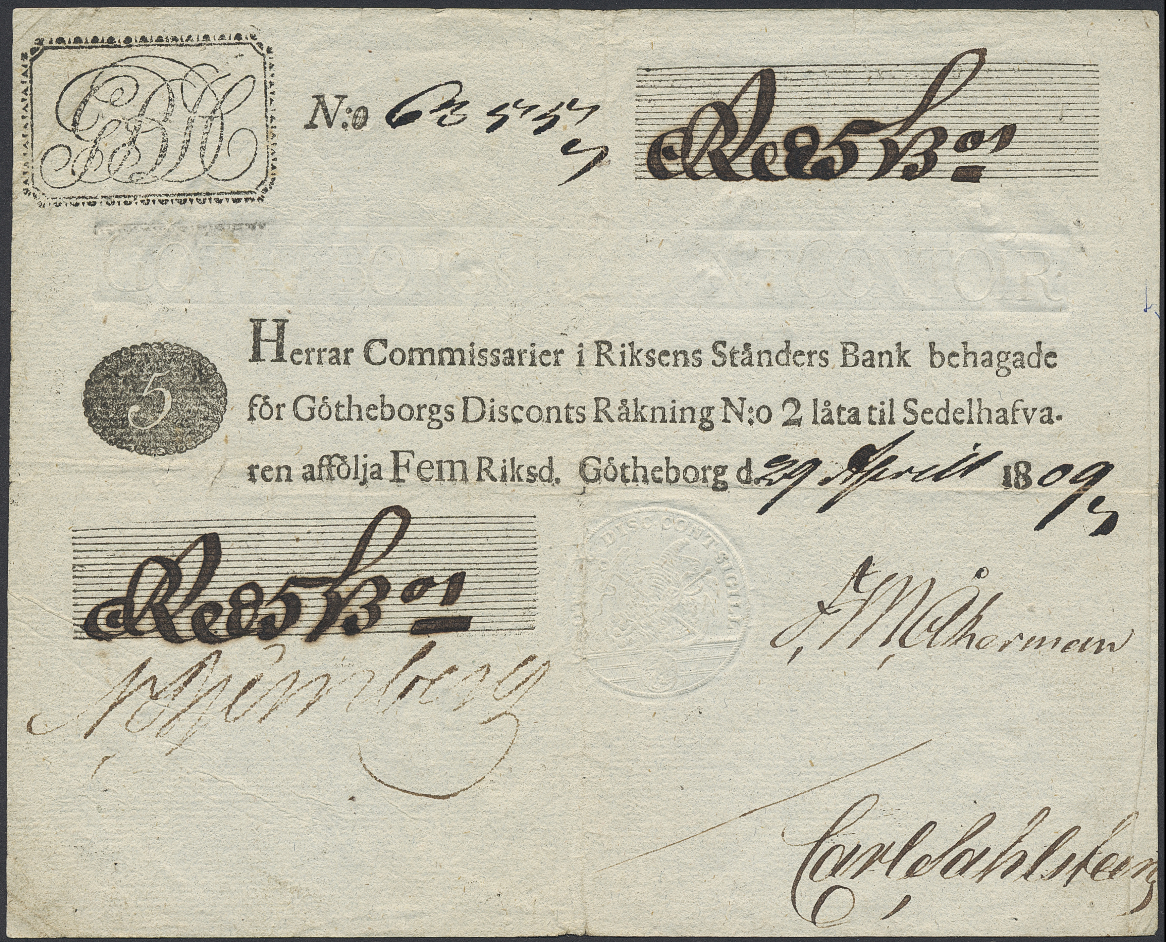 Banknotes, Sweden. 5 riksdaler 1809. Göteborgs Discont, has been mounted on the back. 1/1+.
