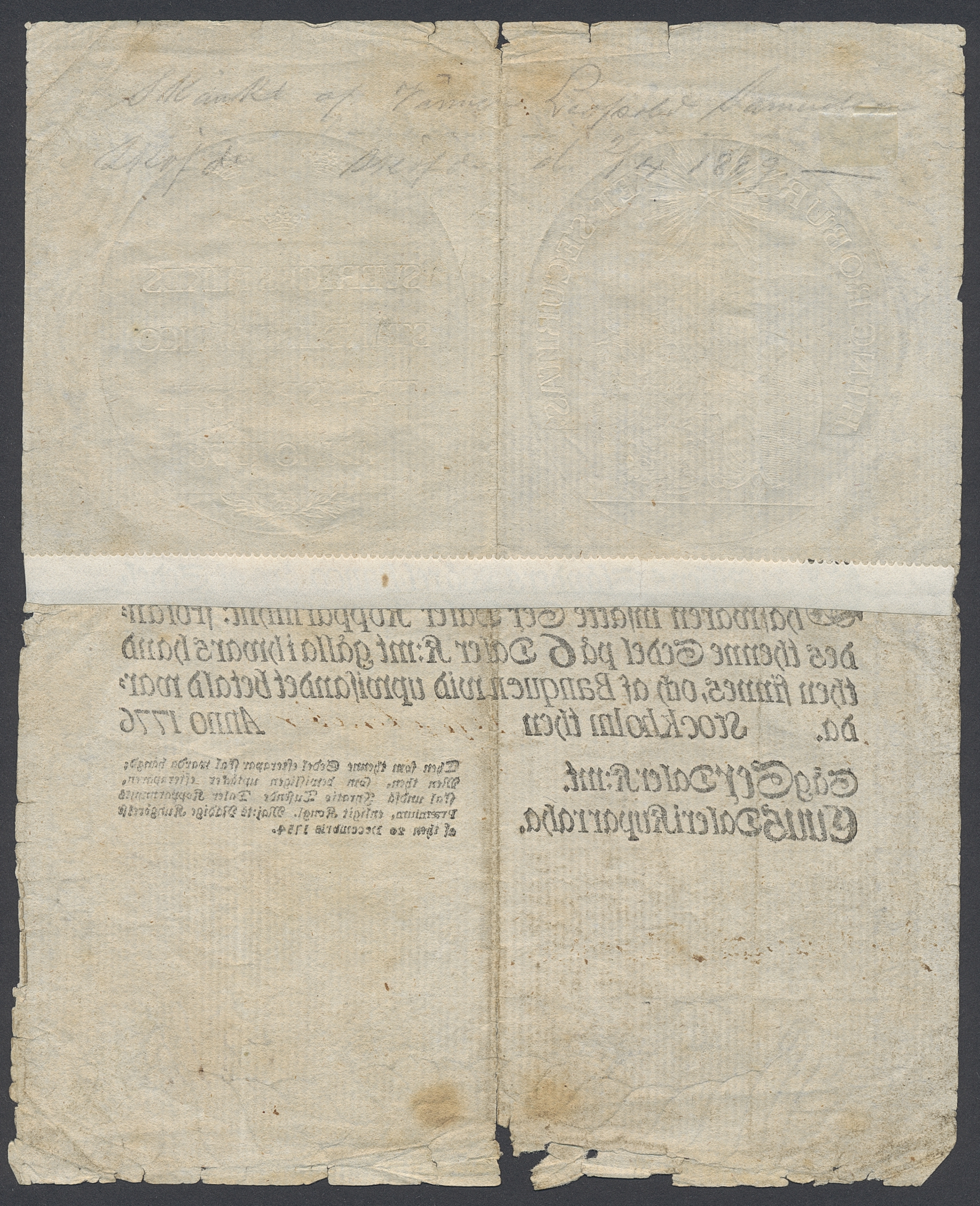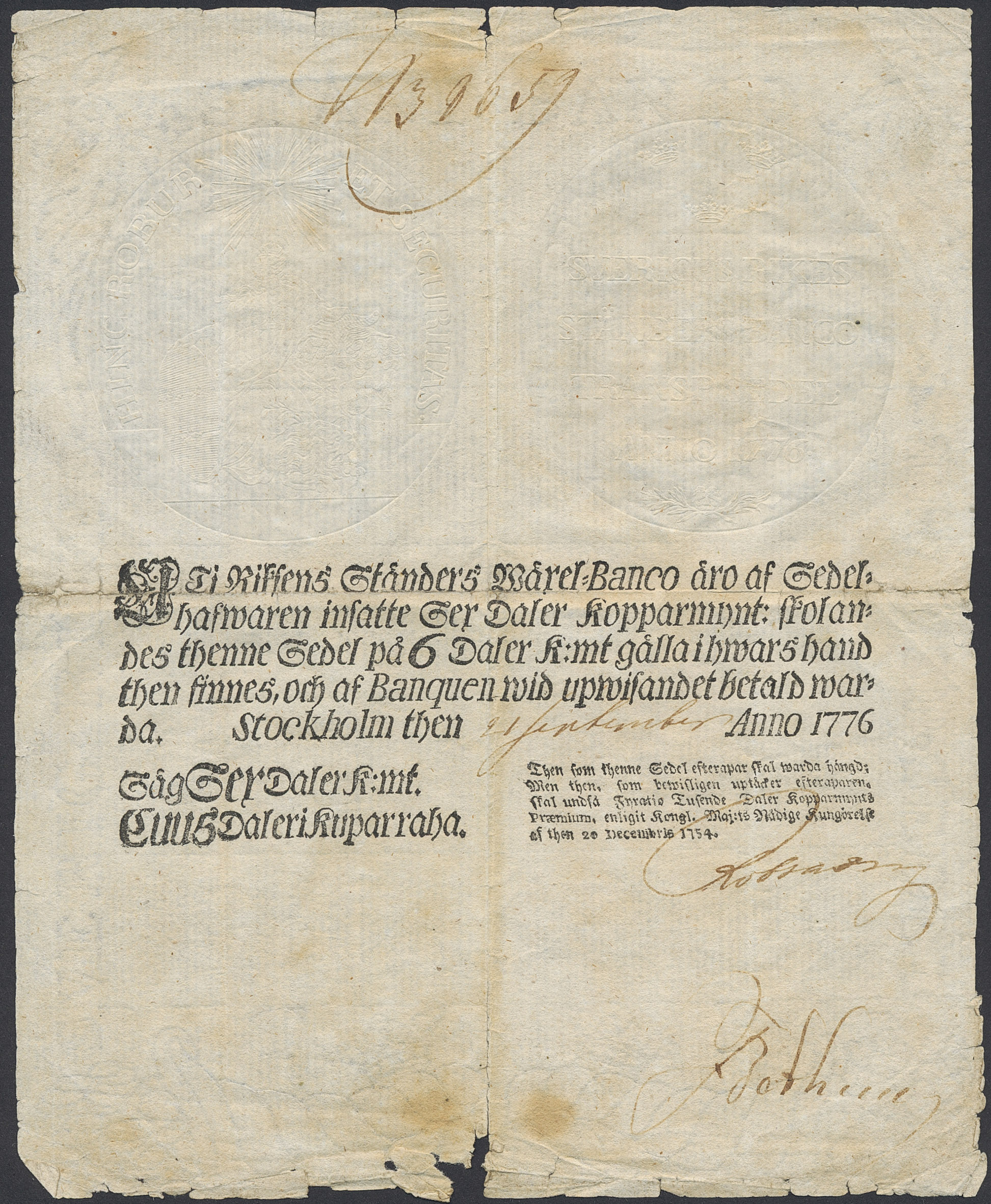 Banknotes, Sweden. 6 daler 1776. Reinforced on the back and with several tears. 1?/1.