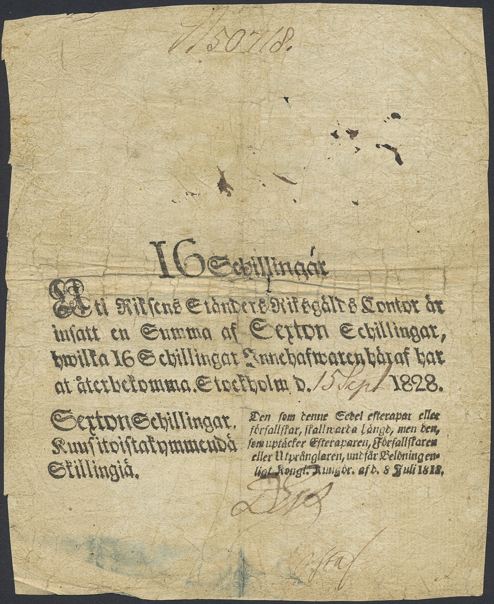 Banknotes, Sweden. Platz 25 A, 16 skillingar 1828. No: 50718. 1?/1.
