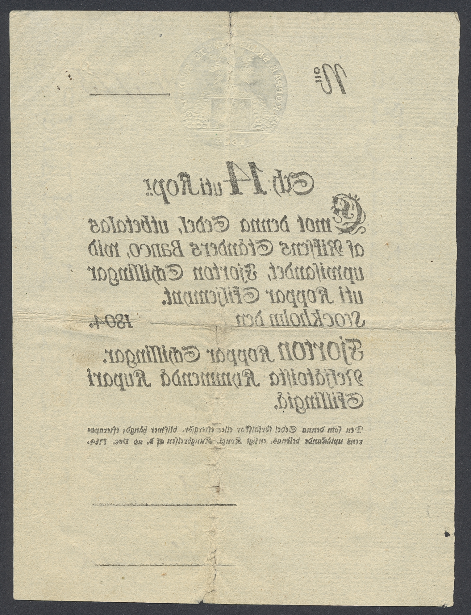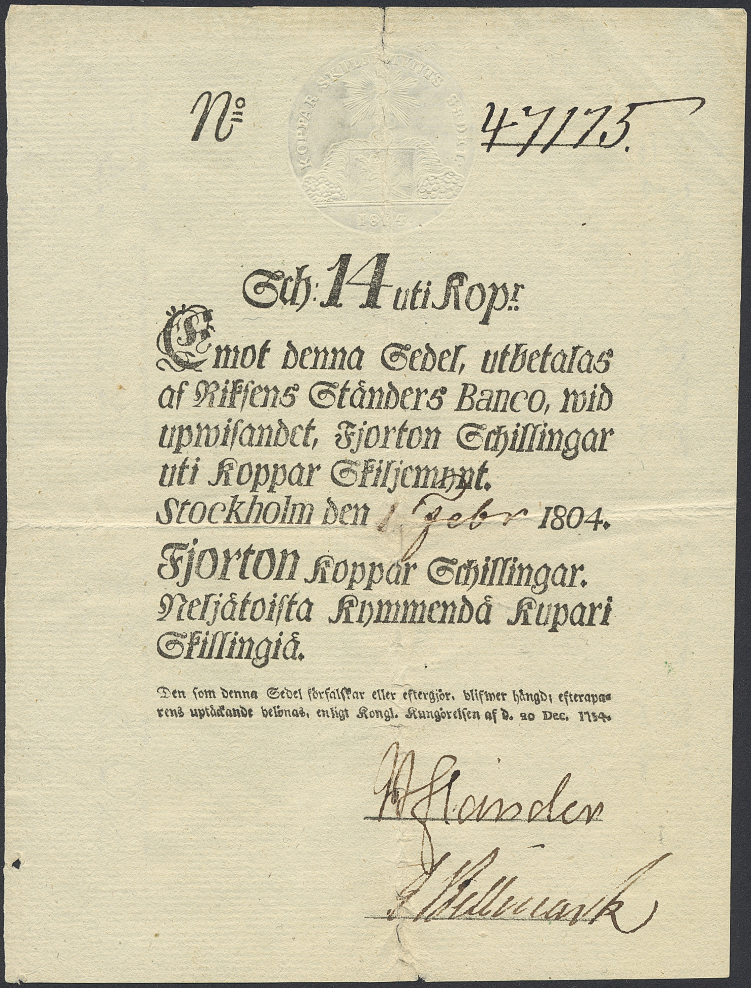 Banknotes, Sweden. Pick A97, 14 kopparskillingar 1804. No 47175. Tear in centre fold. 1/1+.