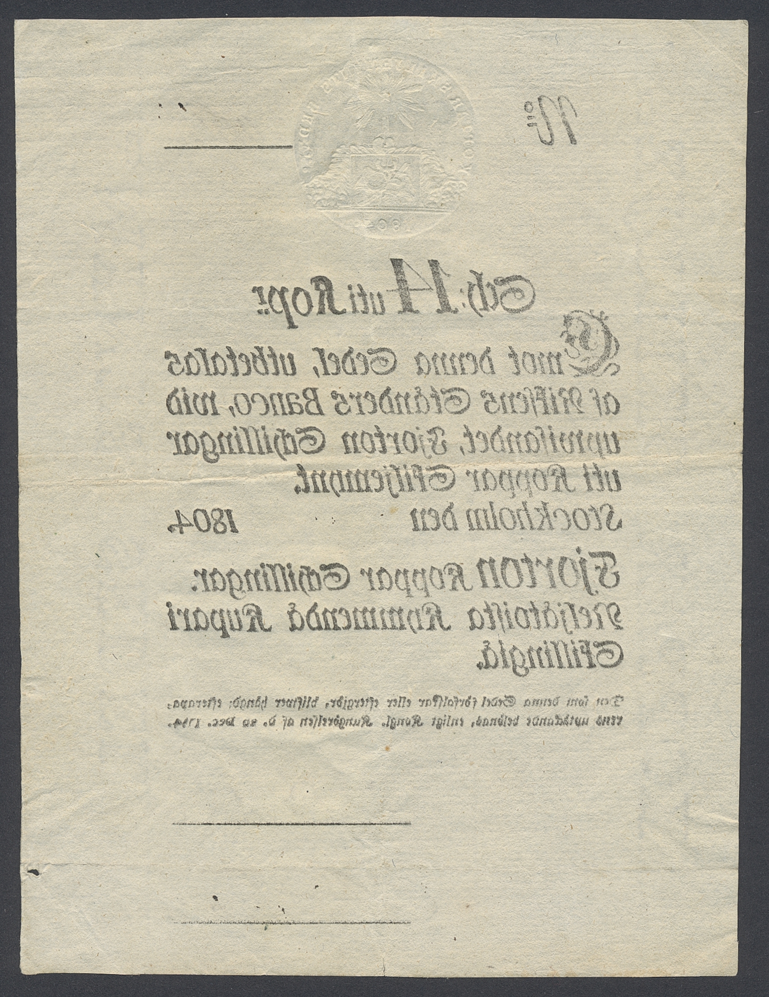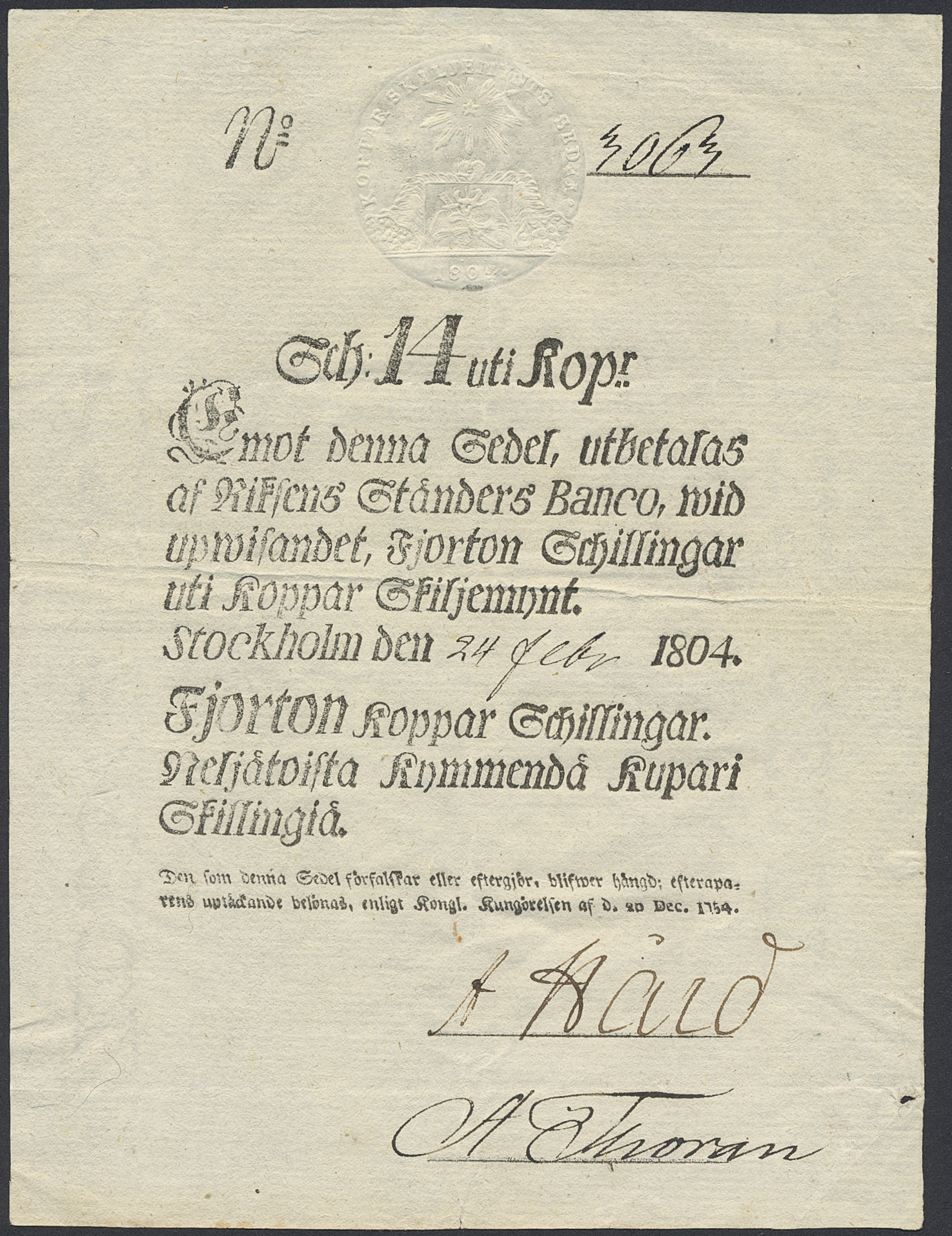 Banknotes, Sweden. Pick A97, 14 kopparskillingar 1804. Small hole. 1+.