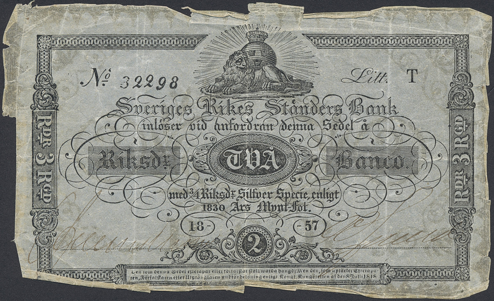 Banknotes, Sweden. SF B2:8, 2 riksdaler banco 1857. Litt. T No 32298. 2/1?
