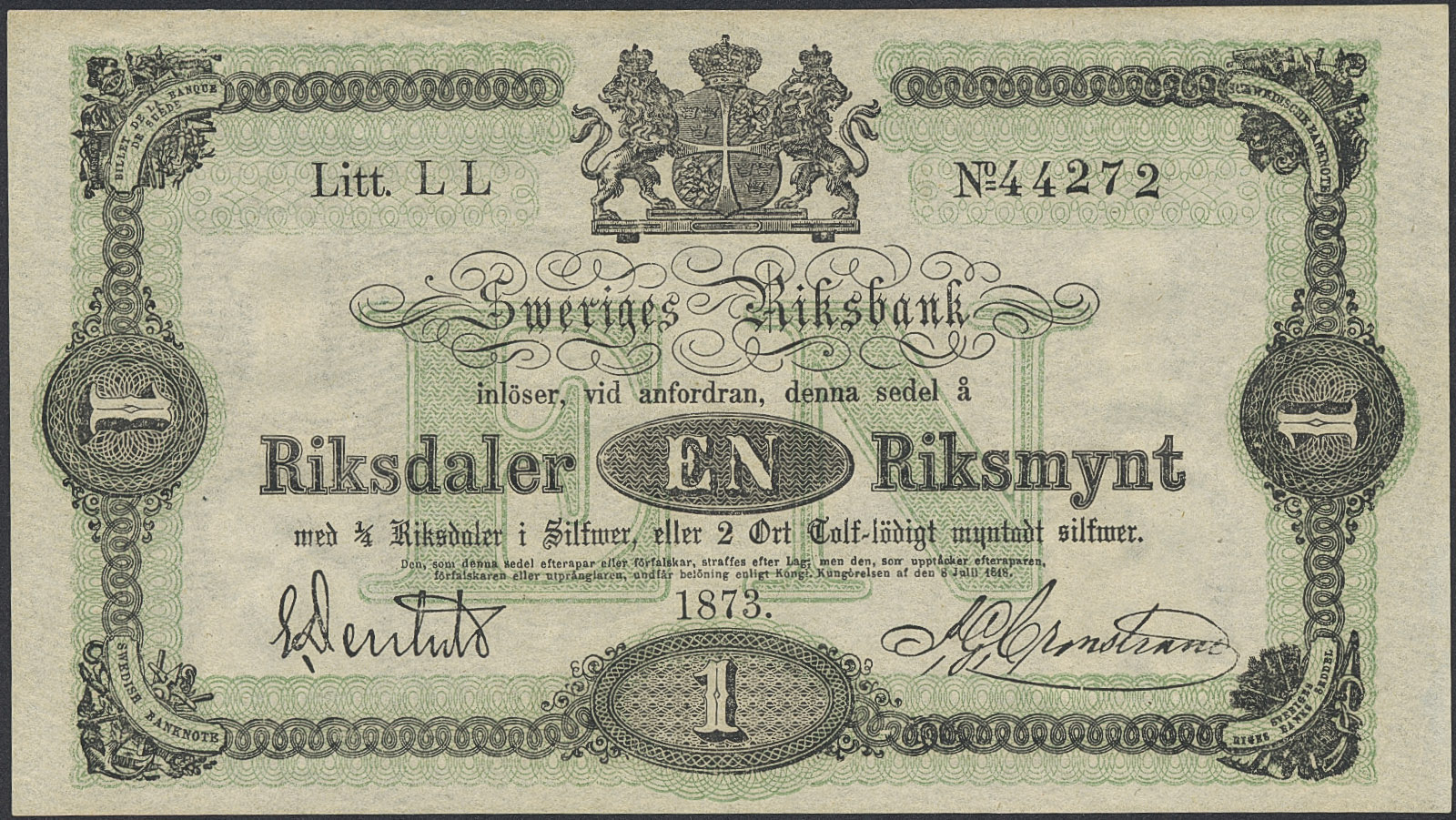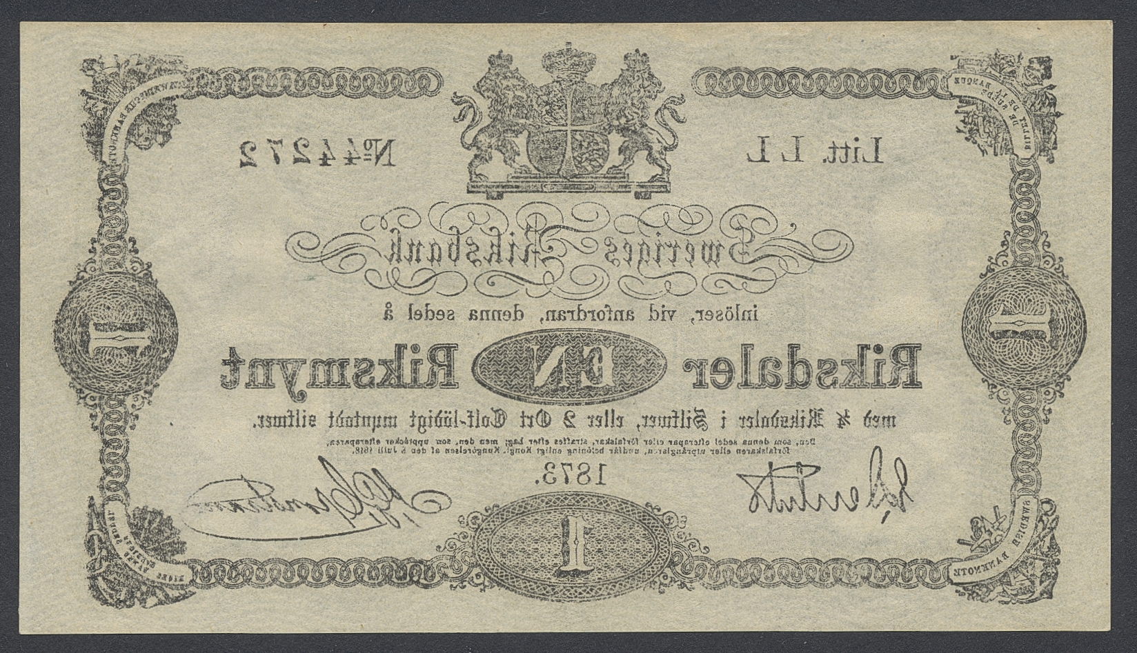 Banknotes, Sweden. SF I5:1, 1 riksdaler riksmynt 1873. Litt LL. No 44272. Centre folded and some handling marks. 01.