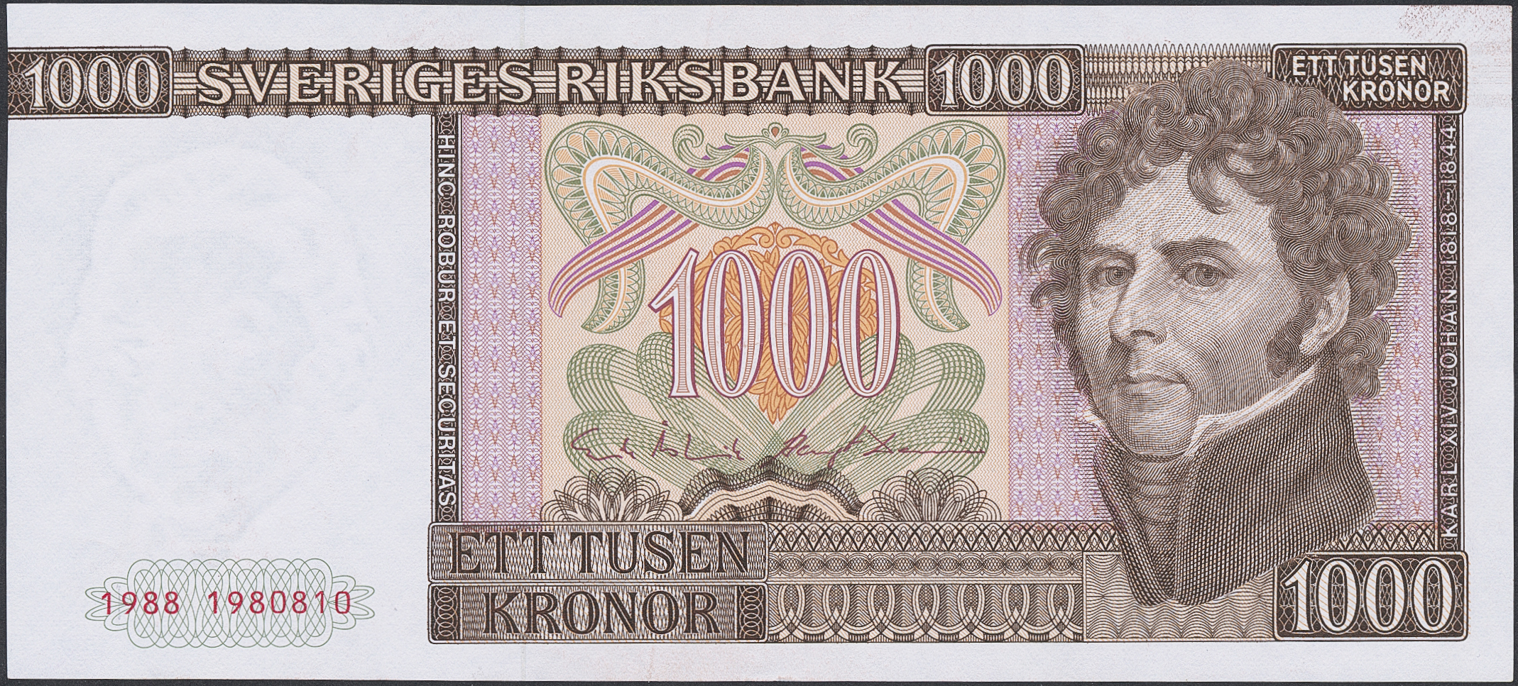 Banknotes, Sweden. SF X10:16, 1000 kronor 1988. Not folded. 01/0.