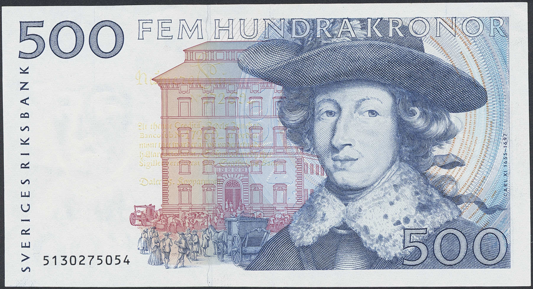 Banknotes, Sweden. SF W1:1, 500 kronor 1985. Light centerfold. 01.