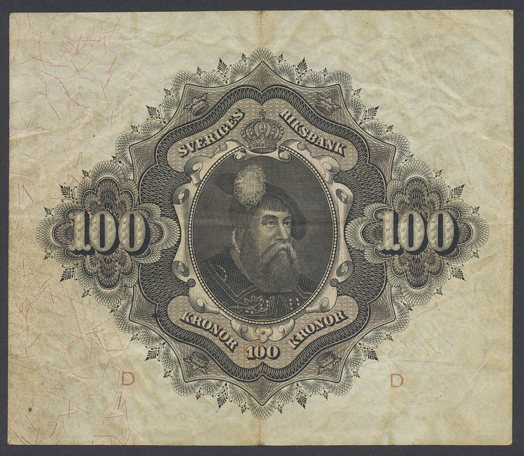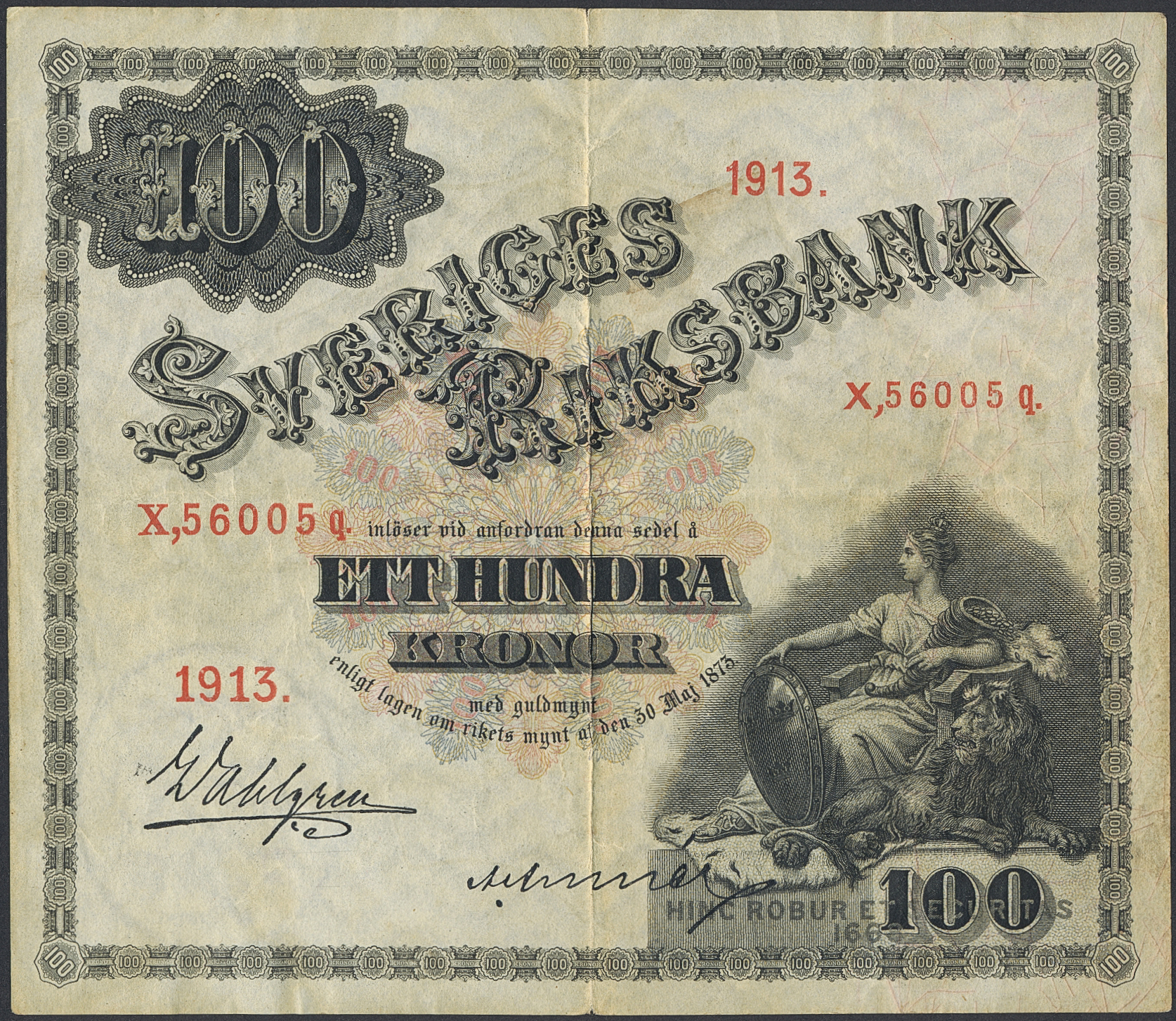 Banknotes, Sweden. SF U7:7, 100 kronor 1913. Lightly toned. 1/1+.